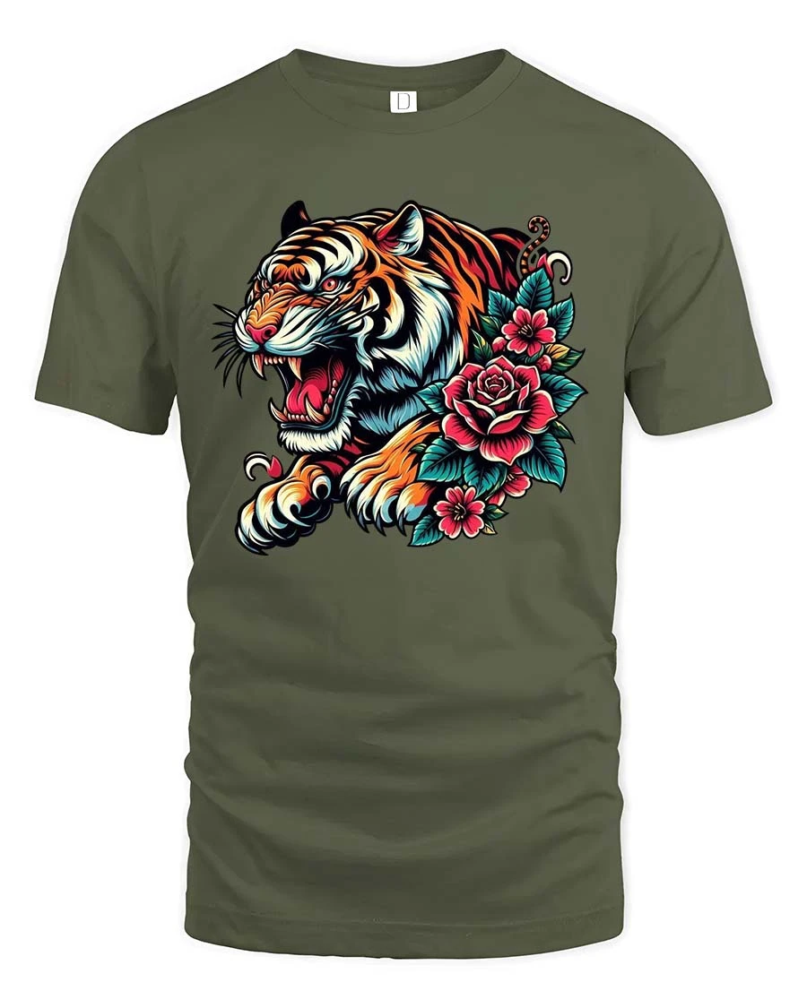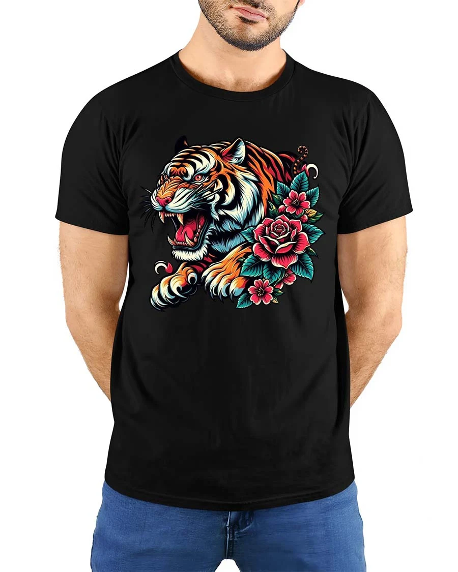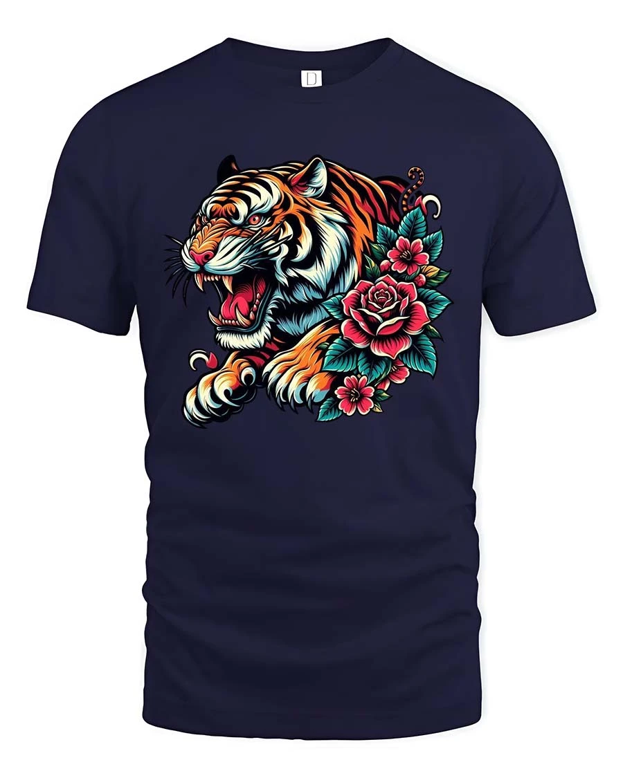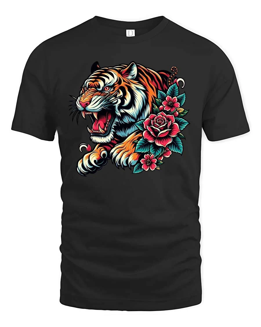 Unleash powerful style with this Tiger Bloom Art T Shirt featuring a fierce tiger head surrounded by vibrant blooming roses. This tiger rose t shirt blends wild animal energy with elegant floral detail, creating a striking design inspired by classic tattoo artistry and bold modern graphics. The sharp lines, vivid colors, and dynamic expression bring intensity and beauty together in one unforgettable look.