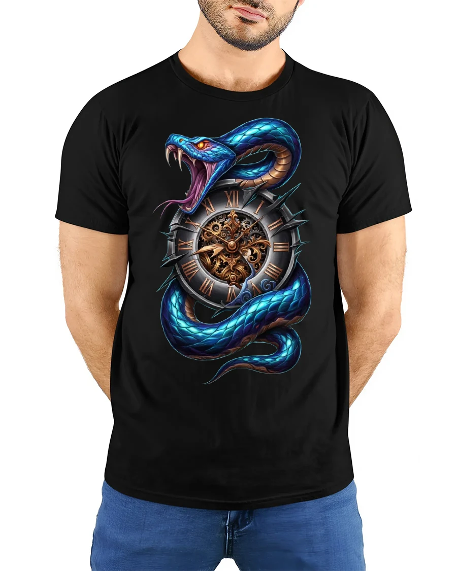 The Time Serpent Clock Snake Graphic Tshirt Dark Fantasy Art showcases a powerful serpent wrapped around an intricate Roman numeral clock.