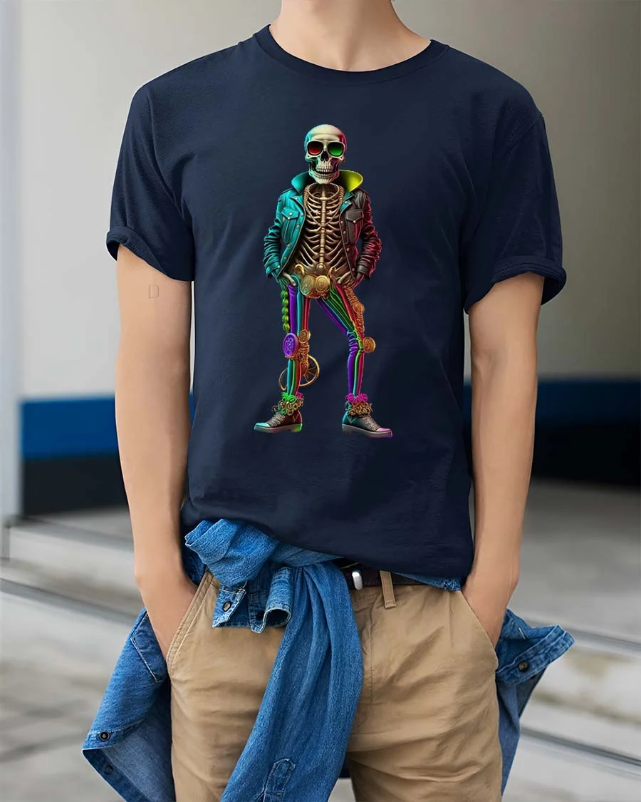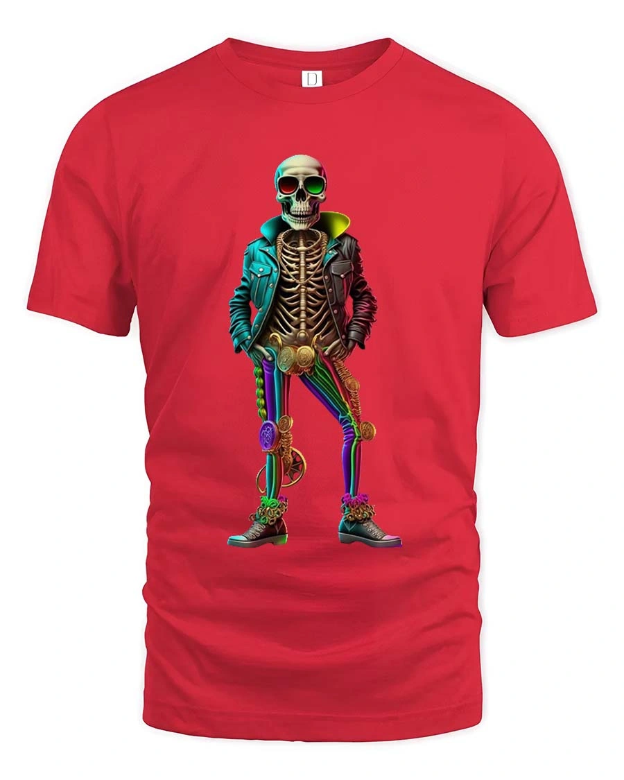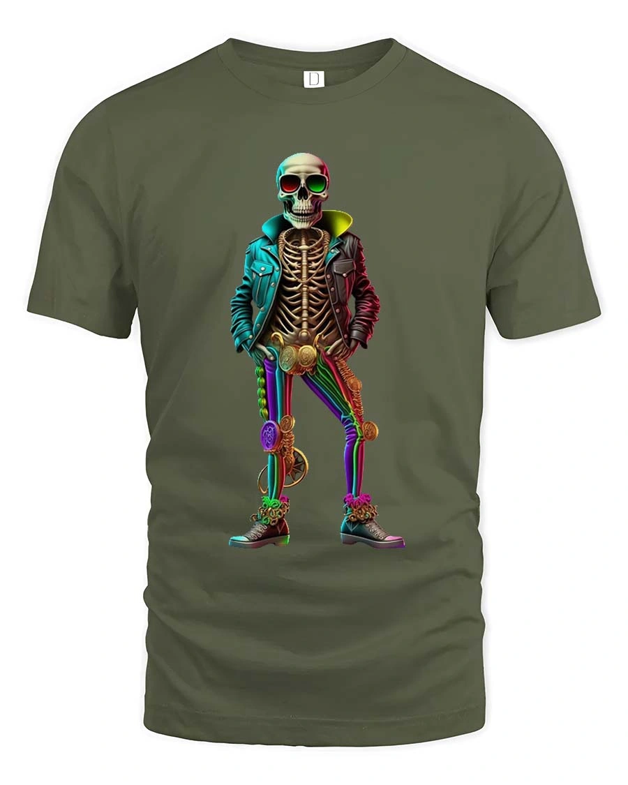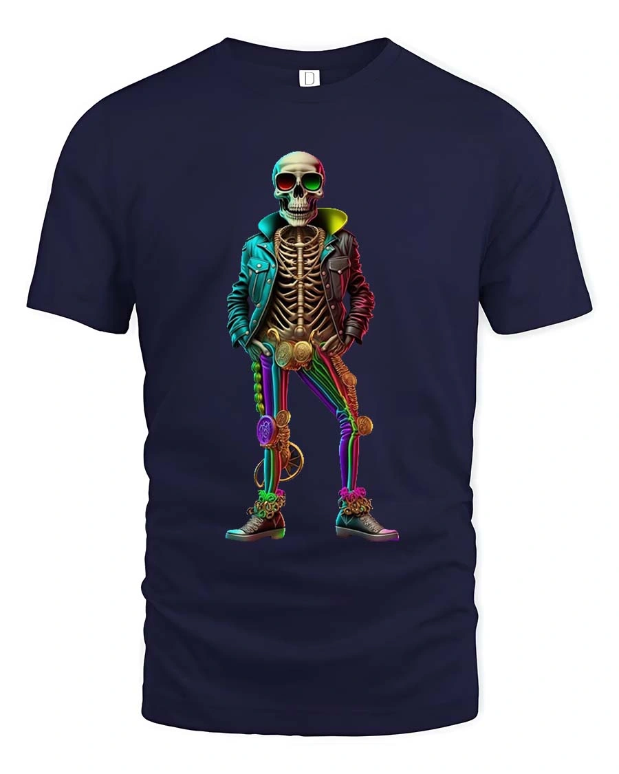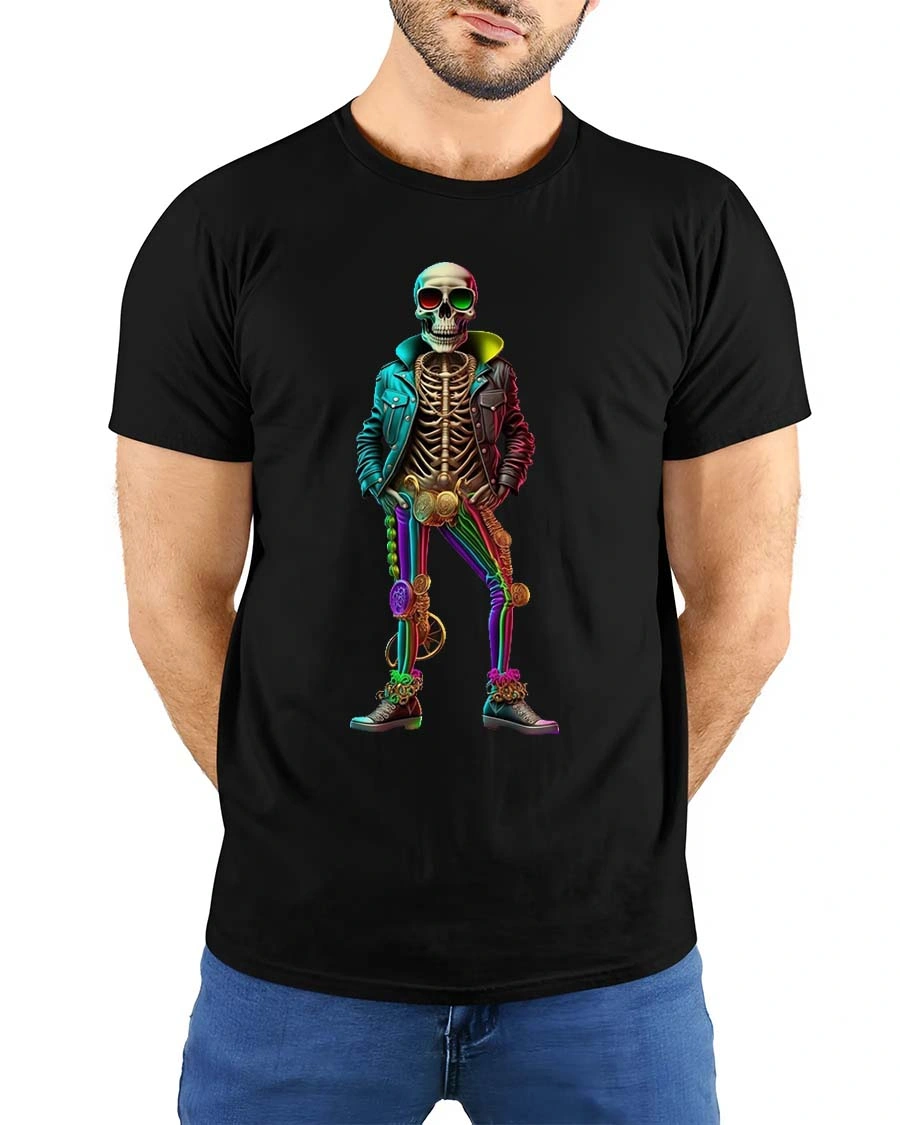 The design features a stylish skeleton dressed in modern streetwear with vibrant neon accents that create a striking and contemporary look.
