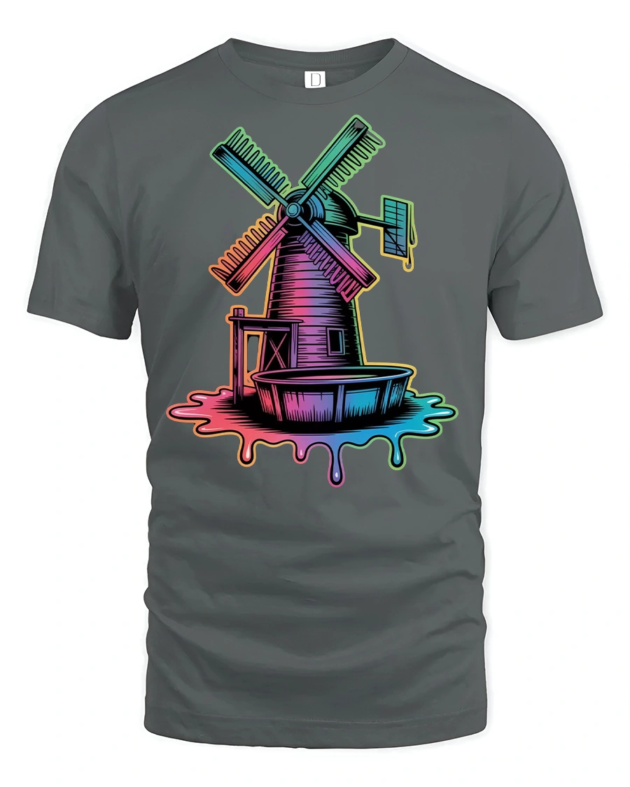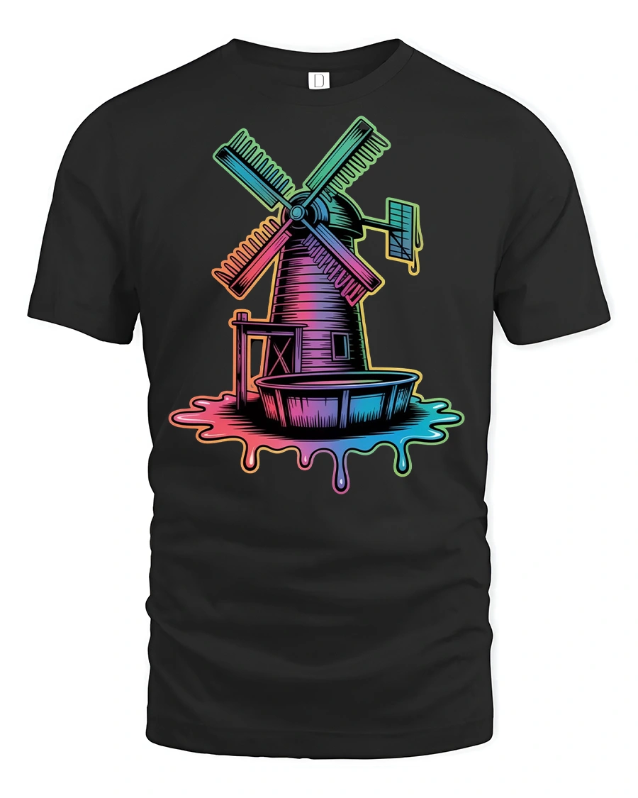 Featuring a dripping, rainbow-colored windmill design, this tee captures the spirit of retro futurism and psychedelic art.