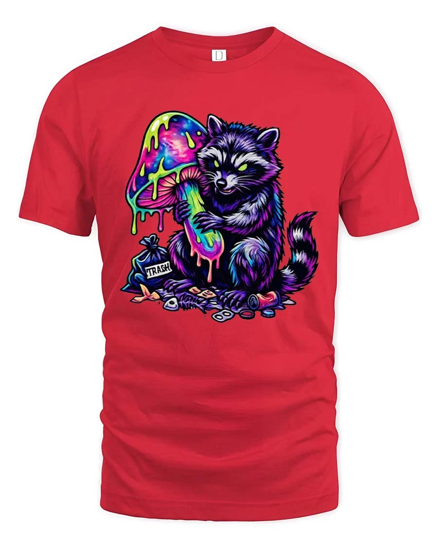 Trippy Raccoon T Shirt Neon Mushroom Psychedelic Art - red t-shirt on white background