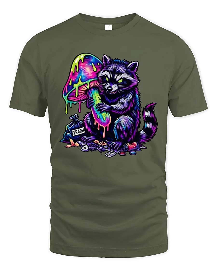 Trippy Raccoon T Shirt Neon Mushroom Psychedelic Art - military green t-shirt on white background