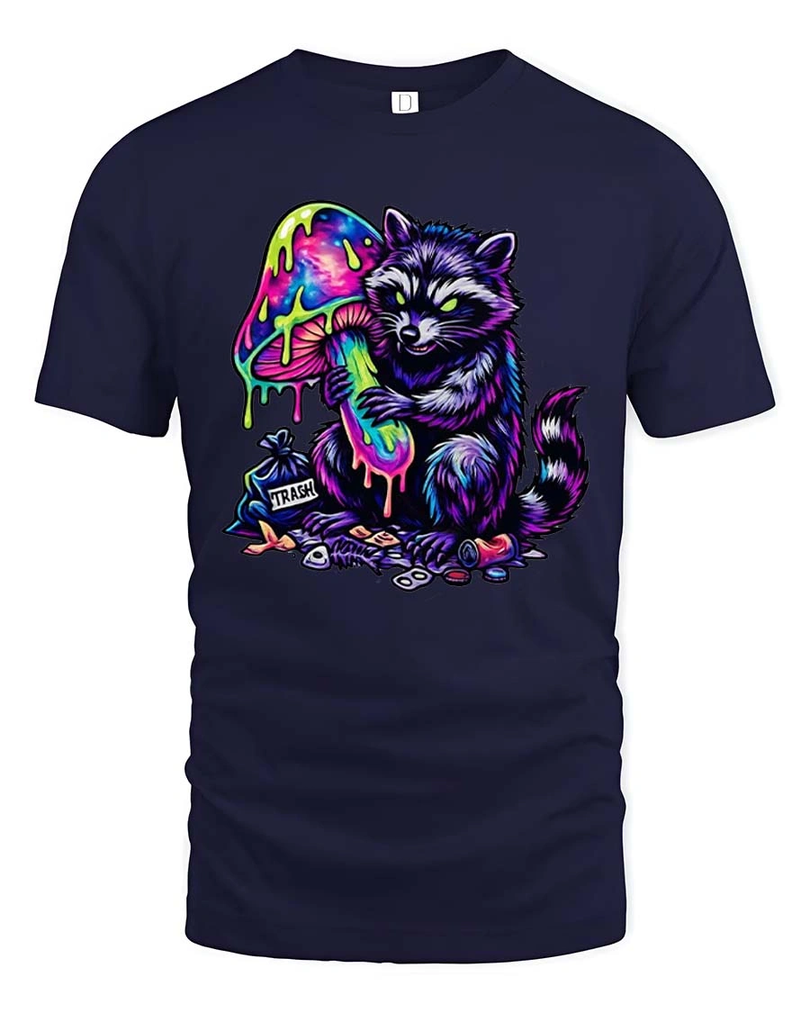 Trippy Raccoon T Shirt Neon Mushroom Psychedelic Art - navy t-shirt on white background