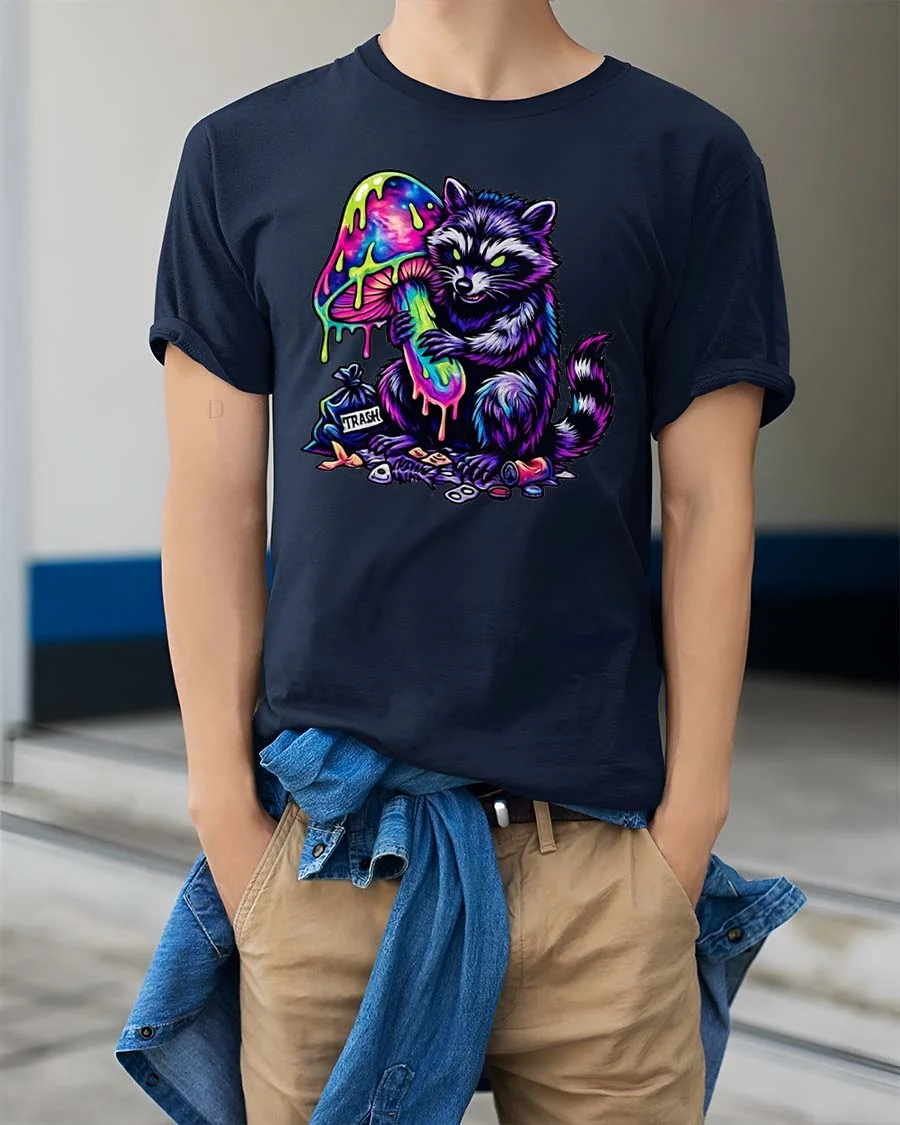 Trippy Raccoon T Shirt Neon Mushroom Psychedelic Art - model wearing navy tee with hands in pockets