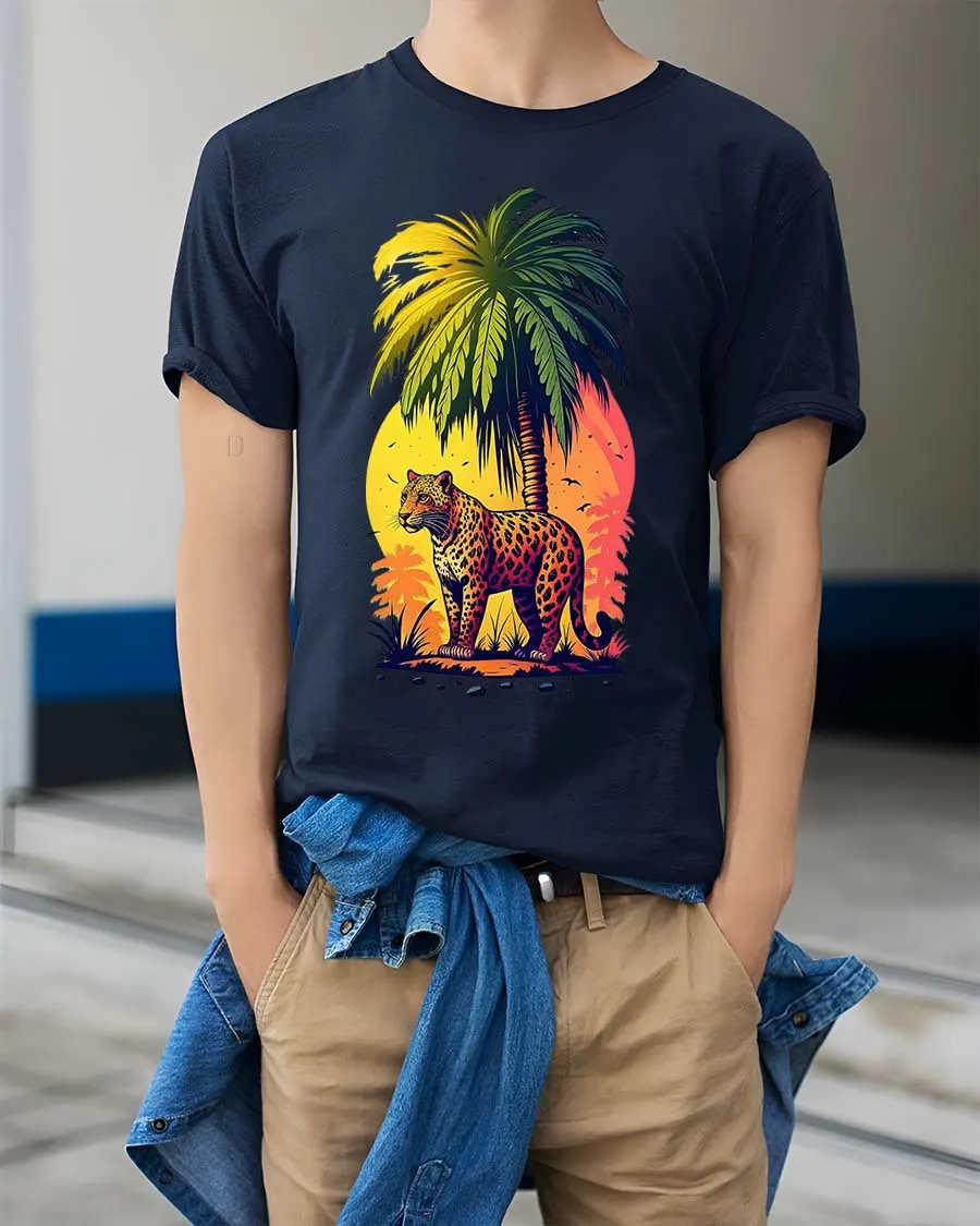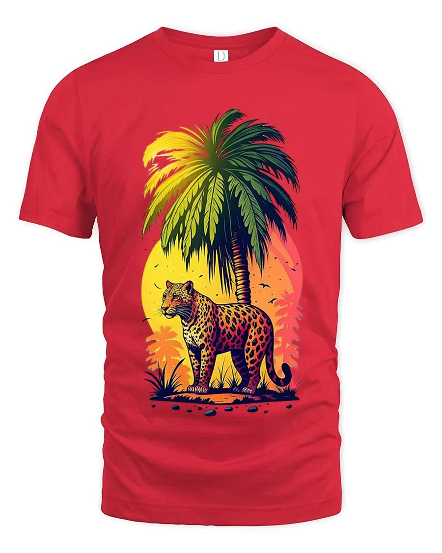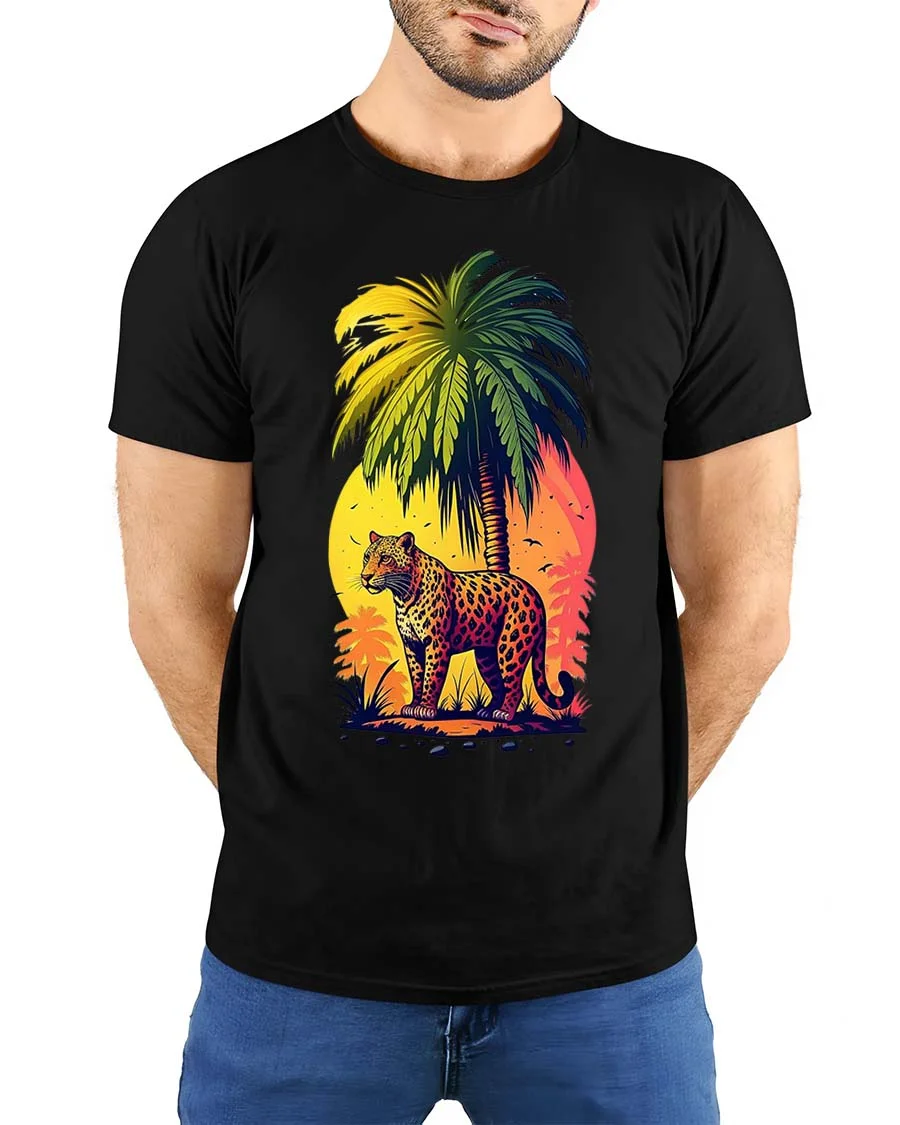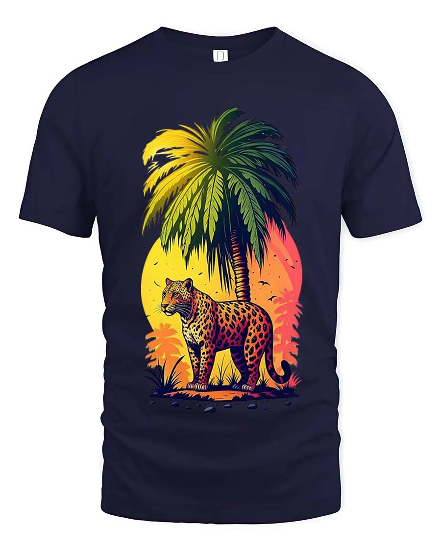 Tropical Leopard Sunset Graphic T Shirt Vibrant Jungle Art Tee features a striking scene of a leopard standing beneath a palm tree against a glowing sunset backdrop.
