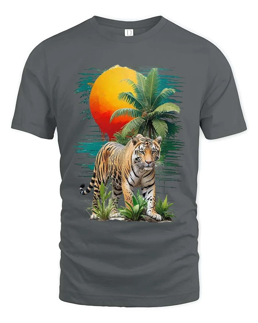 Tropical Tiger Sunset Graphic T Shirt Wild Jungle Nature Art captures the power and beauty of wildlife in a vibrant tropical setting.