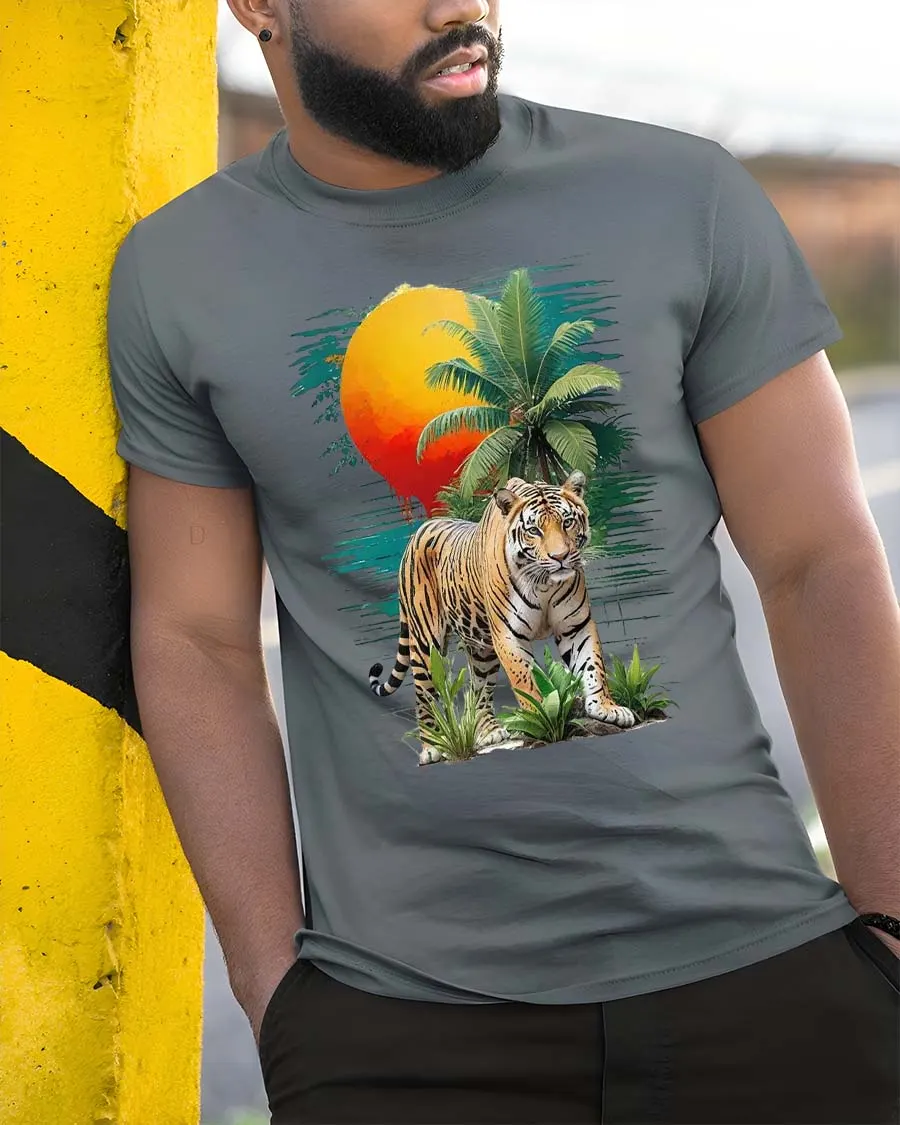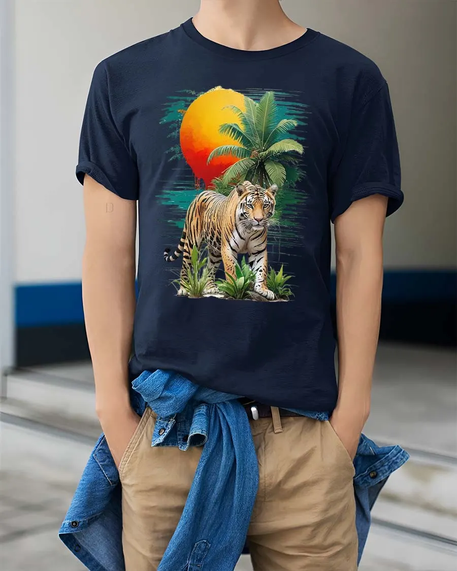 This striking design features a majestic tiger walking through lush greenery with a glowing sunset and palm tree backdrop, creating a bold and eye catching visual.