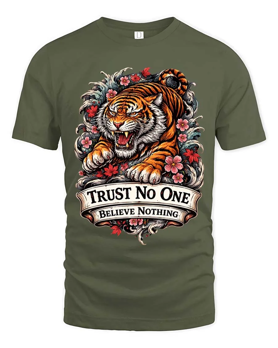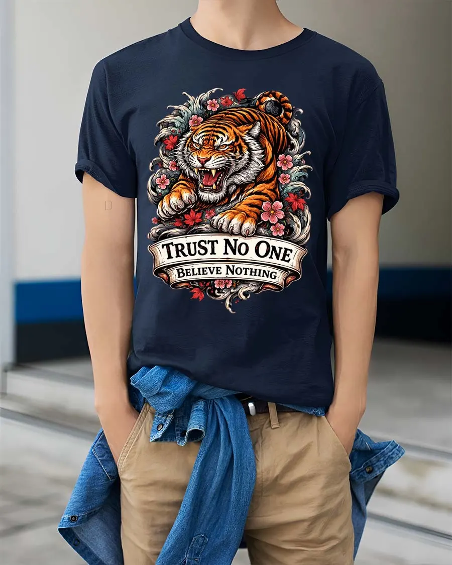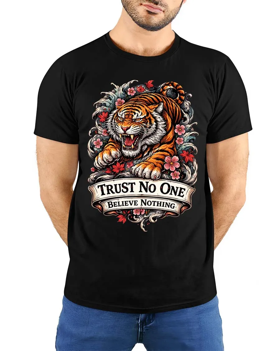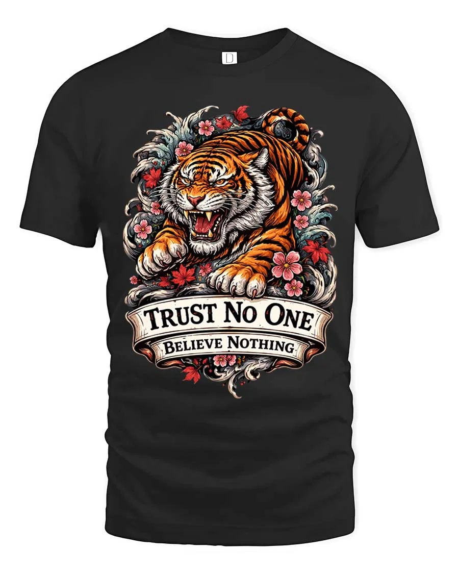 Trust No One Tiger Tshirt Fierce Floral Tattoo Style Graphic combines bold attitude with striking artistic detail.
