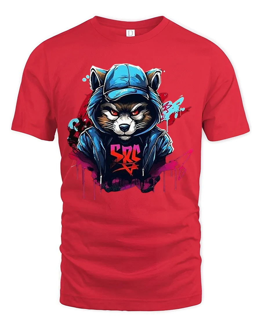 Urban Raccoon Street Art Tee With Bold Graffiti Style Design - red t-shirt on white background