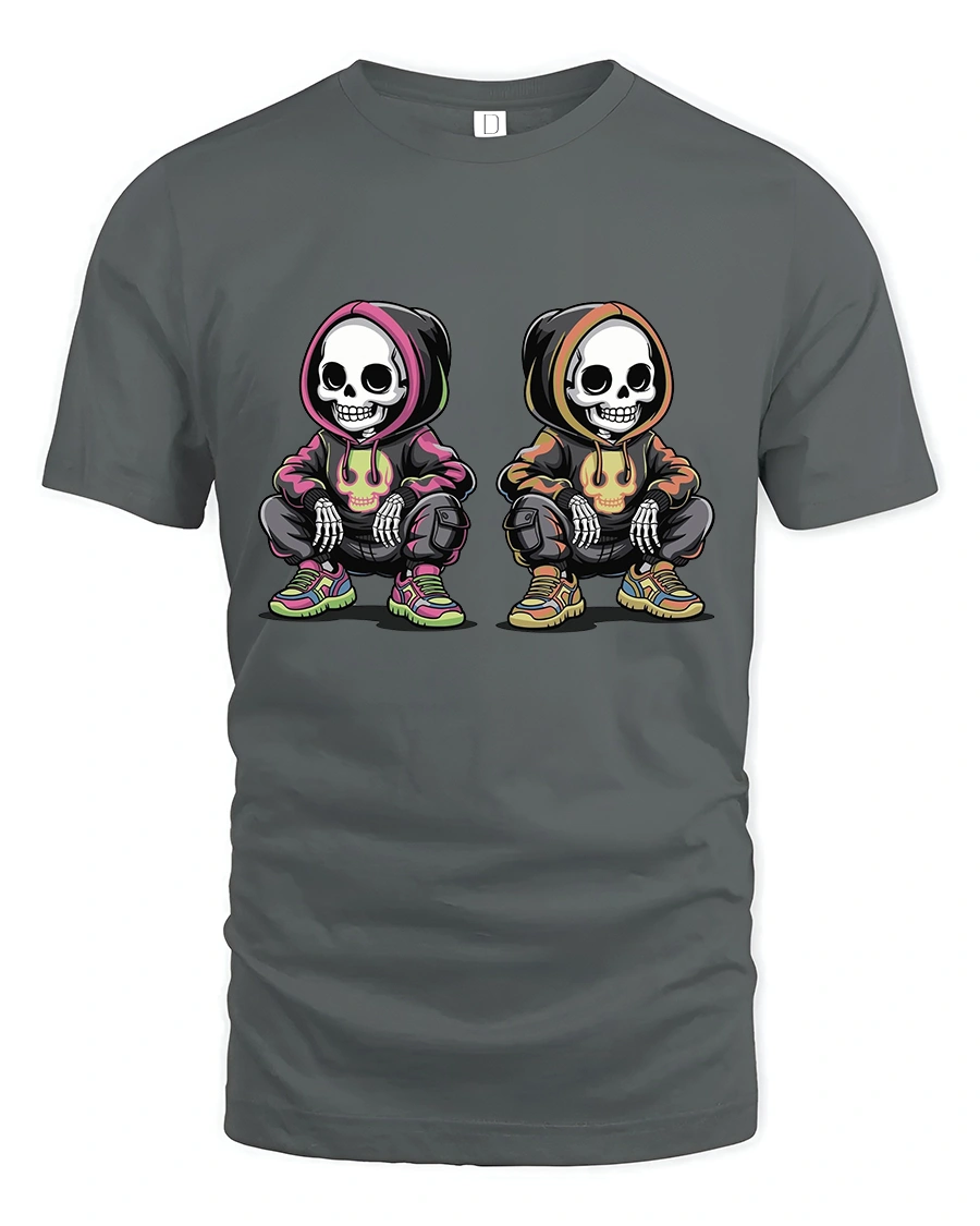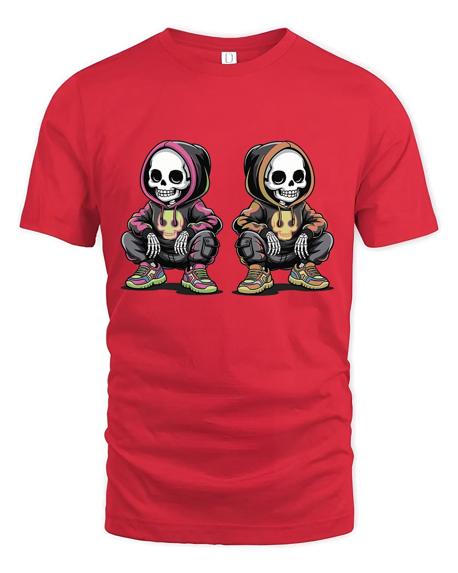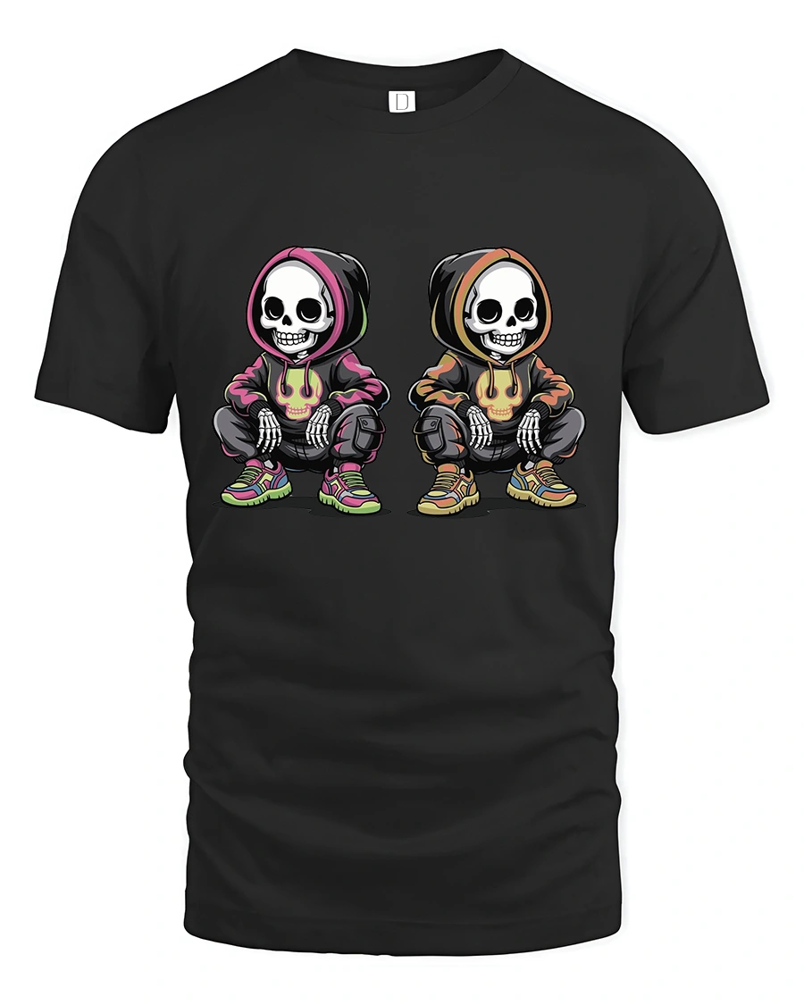 This Urban Skeleton Duo Streetwear Tee with Cool Hoodie Art brings bold personality and street-style attitude to your wardrobe. Featuring two vibrant skeleton characters dressed in colorful hoodies and retro sneakers, this design blends urban culture with playful, edgy artwork. The vivid colors and clean illustration give the tee a modern urban look that stands out effortlessly.