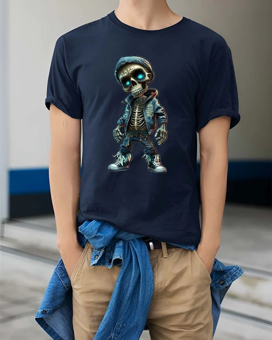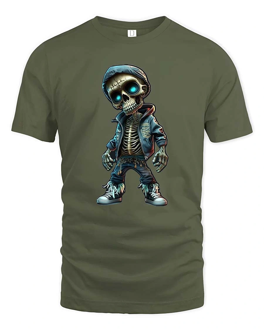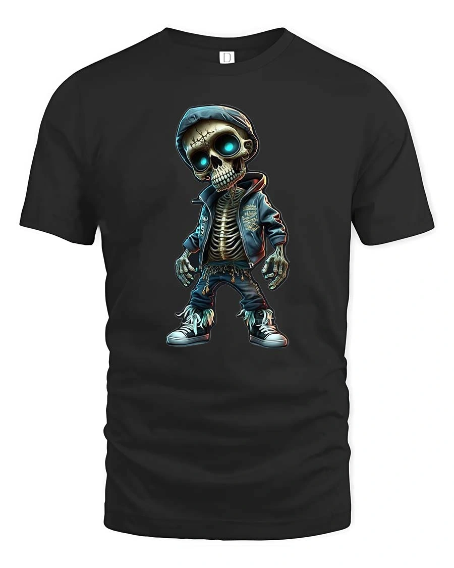 Step into bold city vibes with this Urban Skeleton Hoodie T Shirt featuring a stylish skeleton character rocking a hoodie and sneakers with glowing blue eyes. This skeleton t shirt blends playful cartoon detail with modern streetwear attitude, creating a standout design that feels both edgy and fun. The detailed bones, layered outfit elements, and vibrant eye glow bring this graphic to life with strong urban personality.