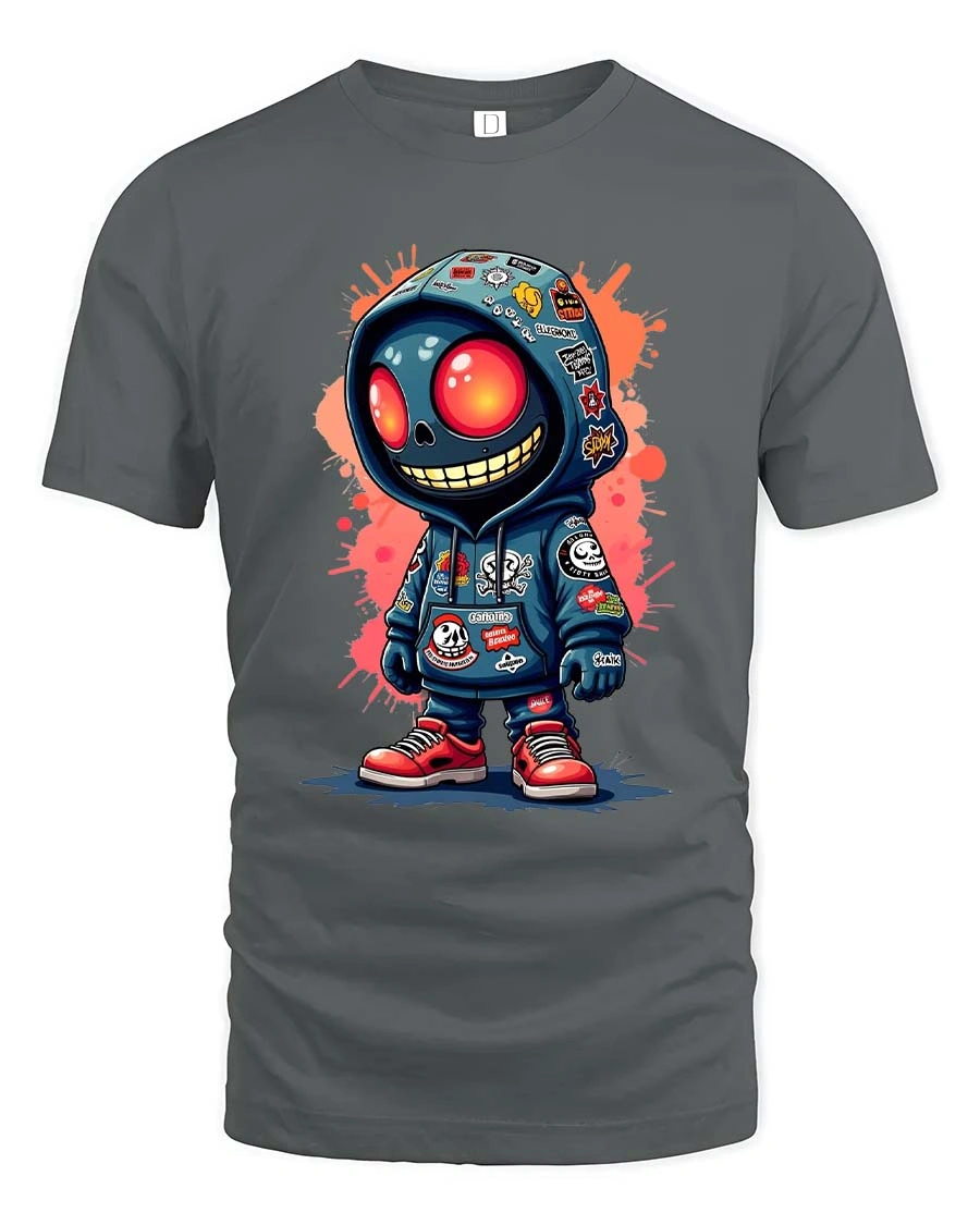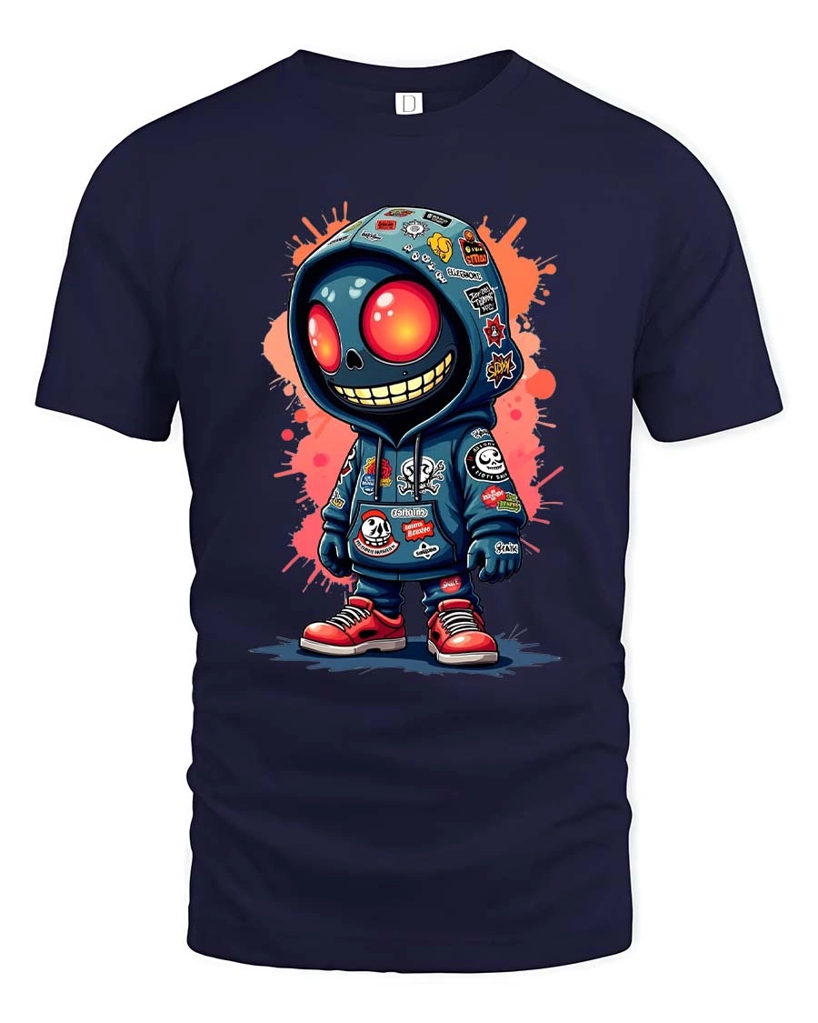 The design features a stylized skull character in a hoodie with vibrant details and graffiti elements that stand out instantly.