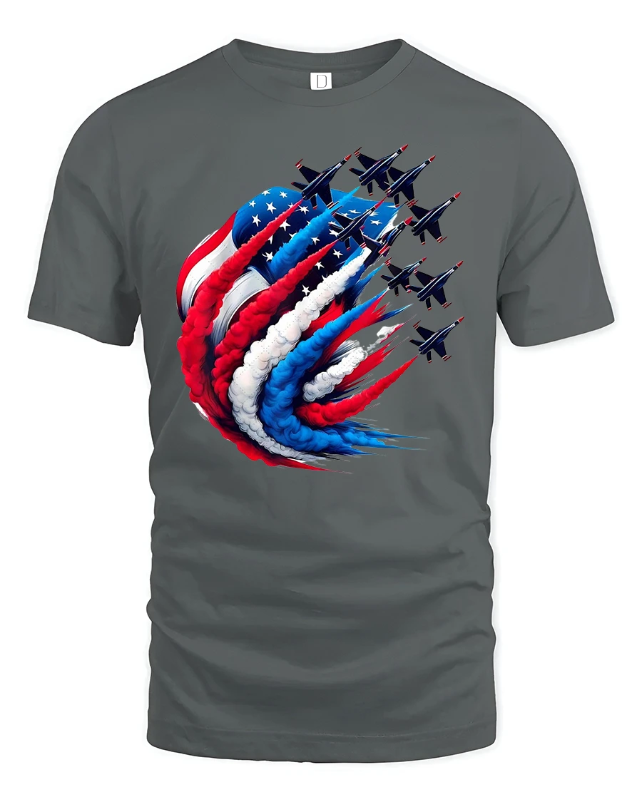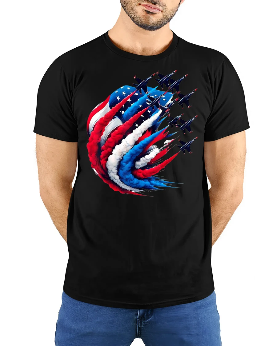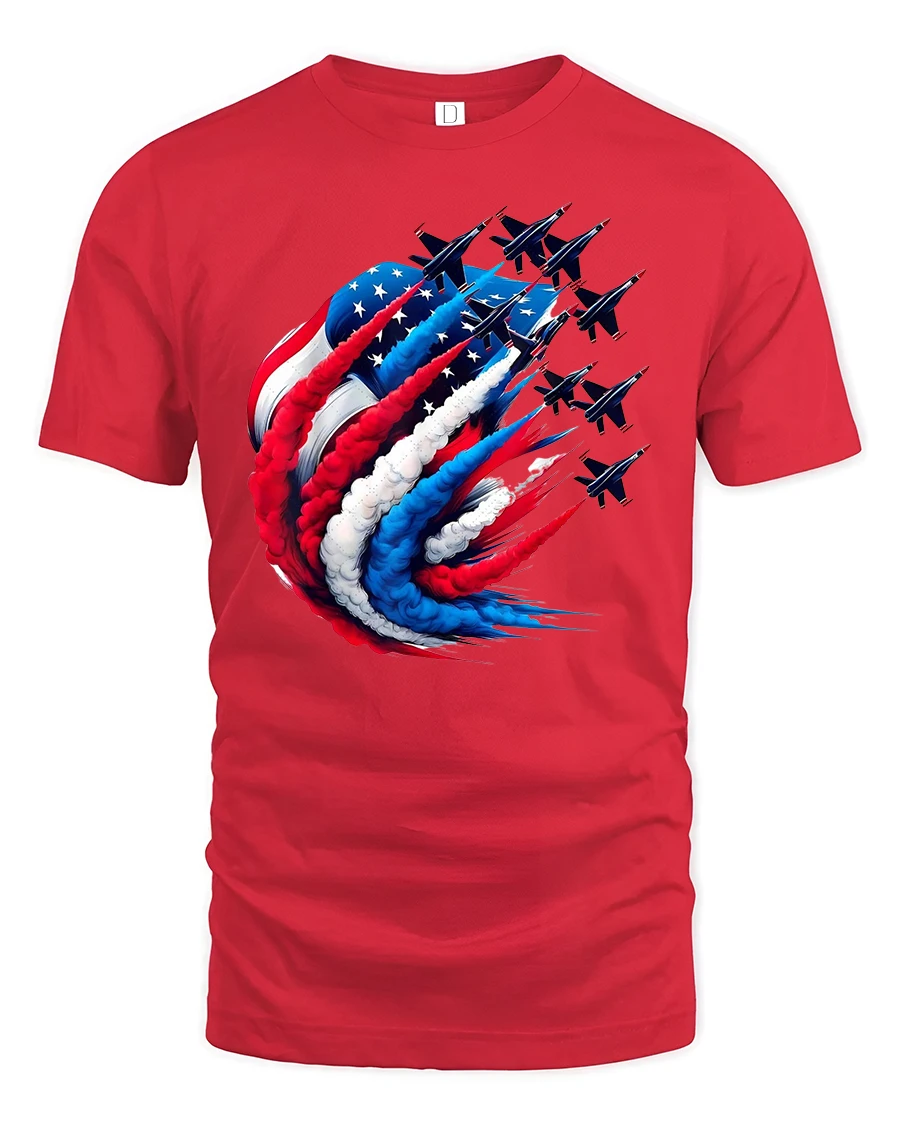 Celebrate American pride in bold style with the USA Flag Fighter Jets Patriotic Flyover Graphic Tee. This design features fighter jets soaring in formation, leaving behind red, white, and blue smoke trails that merge into the stars and stripes of the American flag. It’s the perfect blend of aviation power and patriotic spirit, making it a must-have for anyone who loves freedom and flight.