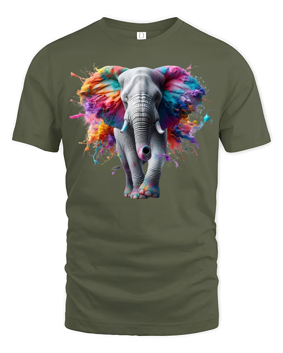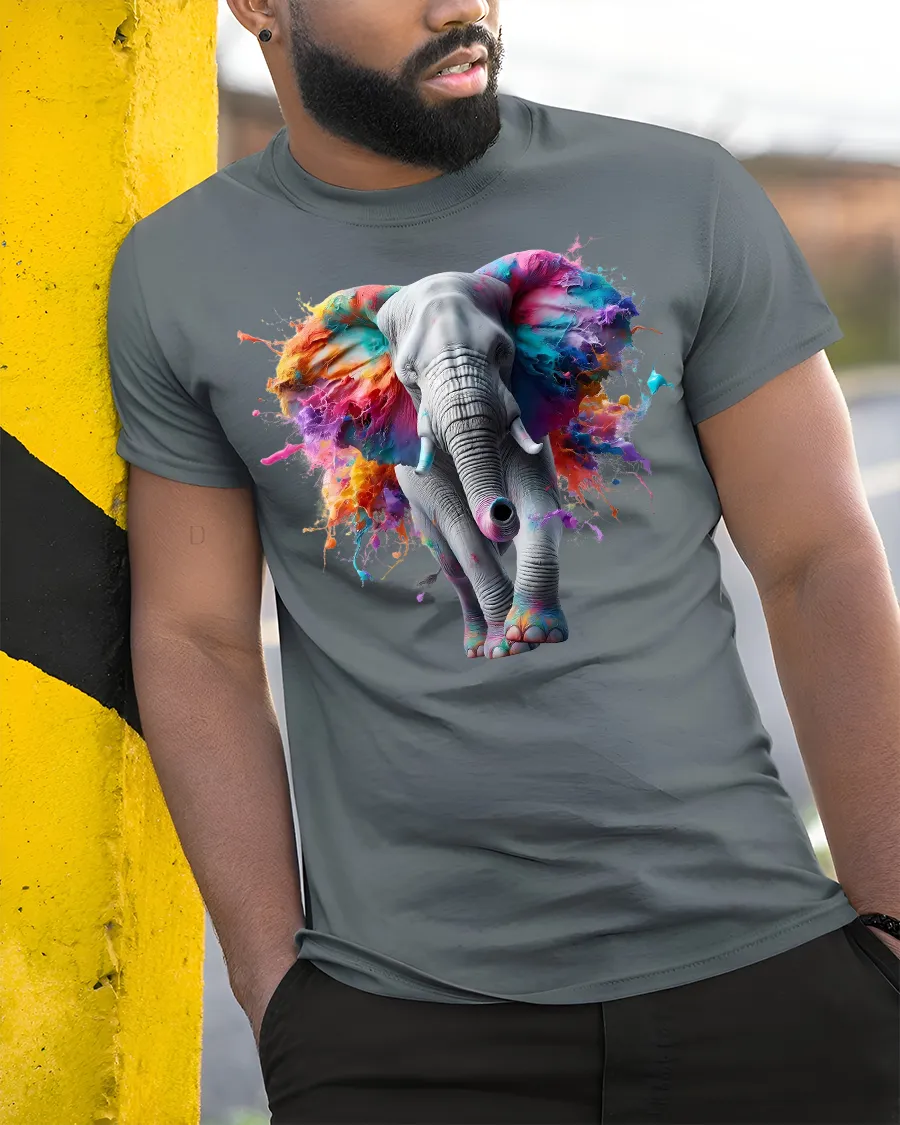 Make a statement with the Vibrant Elephant Splash Art Tee for Bold Style, a stunning design that merges the majesty of elephants with an explosion of colors. This unique tee showcases a powerful elephant with ears bursting into a vibrant splash of artistic color, perfect for those who love bold fashion and animal-inspired art.