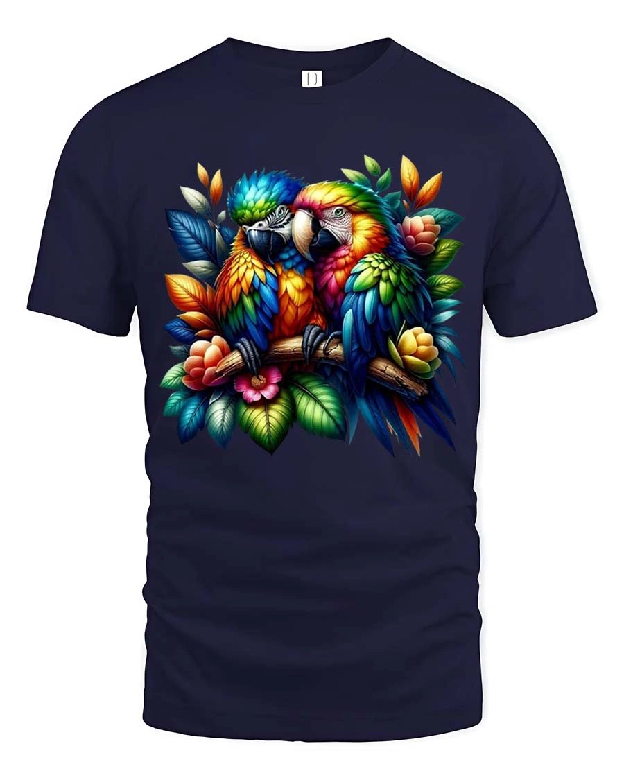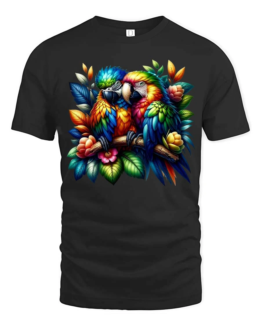 Vibrant Macaw Couple Art Tshirt Exotic Jungle Bird Tee brings a bold and lively design that instantly catches attention with its vibrant macaw artwork.