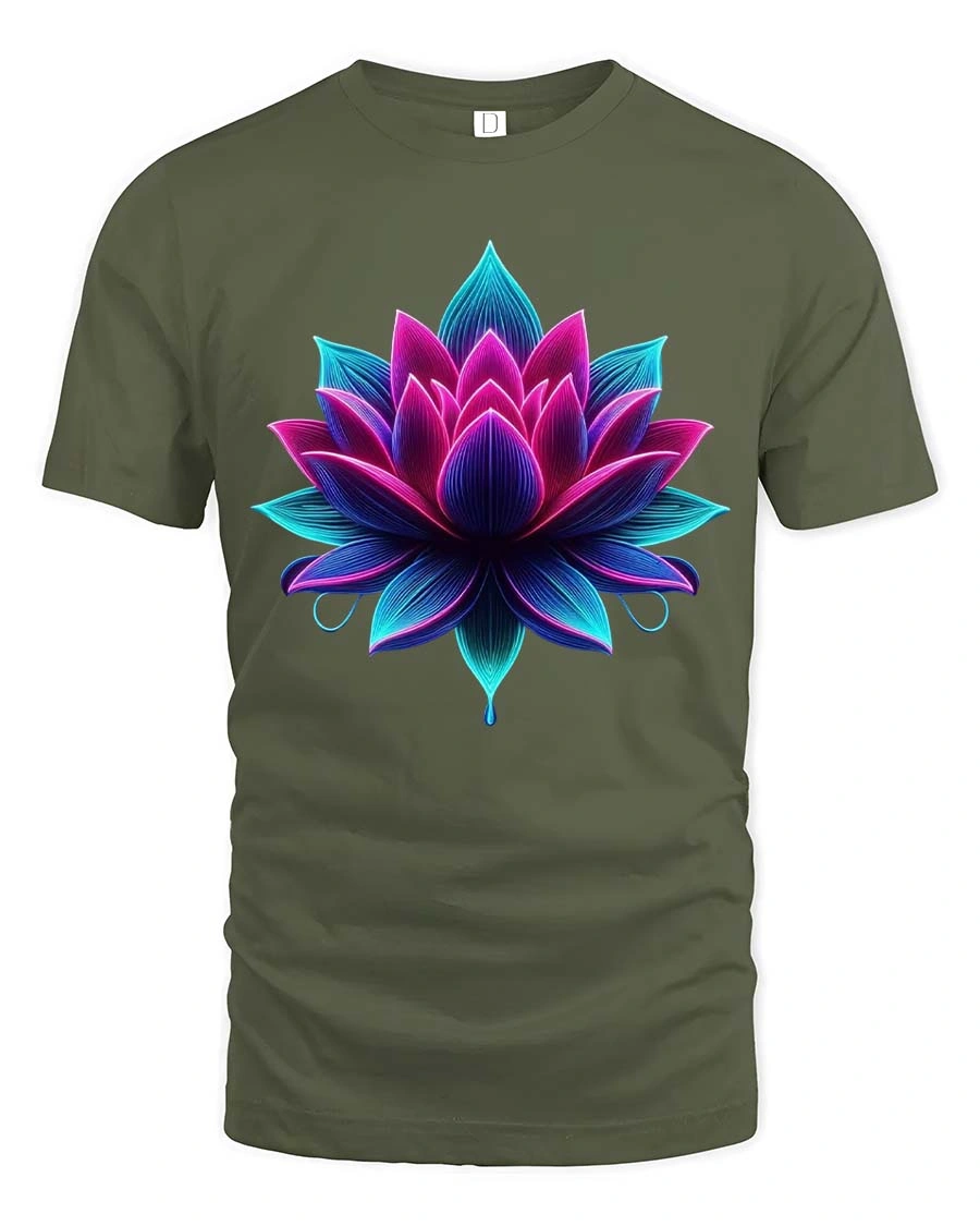 Vibrant Neon Lotus Flower Spiritual Art T Shirt - military green t-shirt on white background