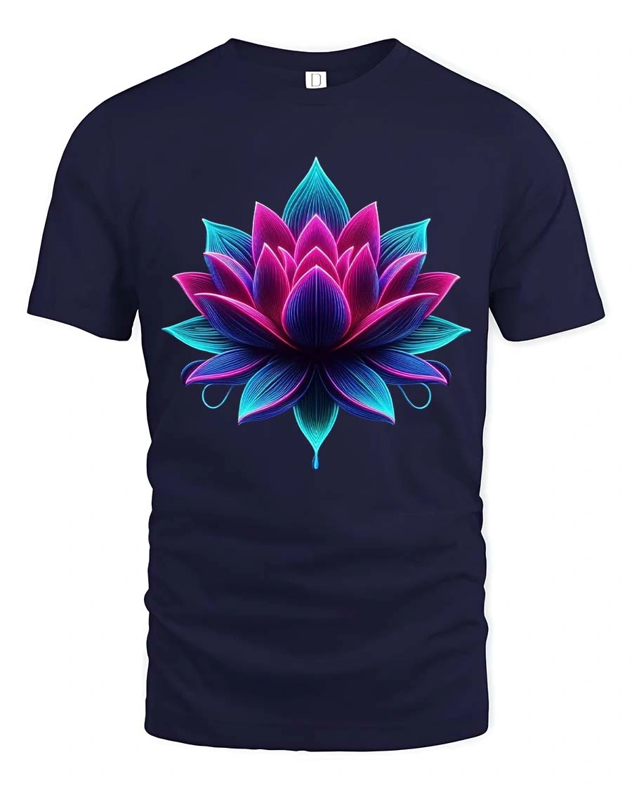 Vibrant Neon Lotus Flower Spiritual Art T Shirt - navy t-shirt on white background