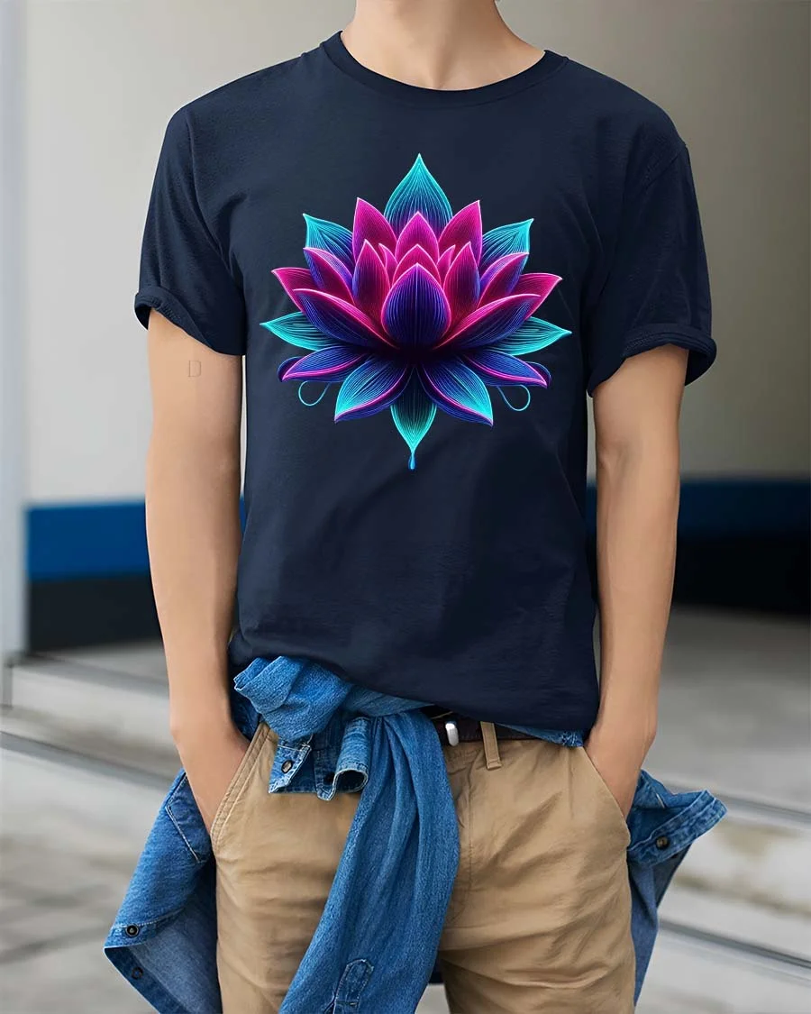 Vibrant Neon Lotus Flower Spiritual Art T Shirt - model wearing navy tee with hands in pockets