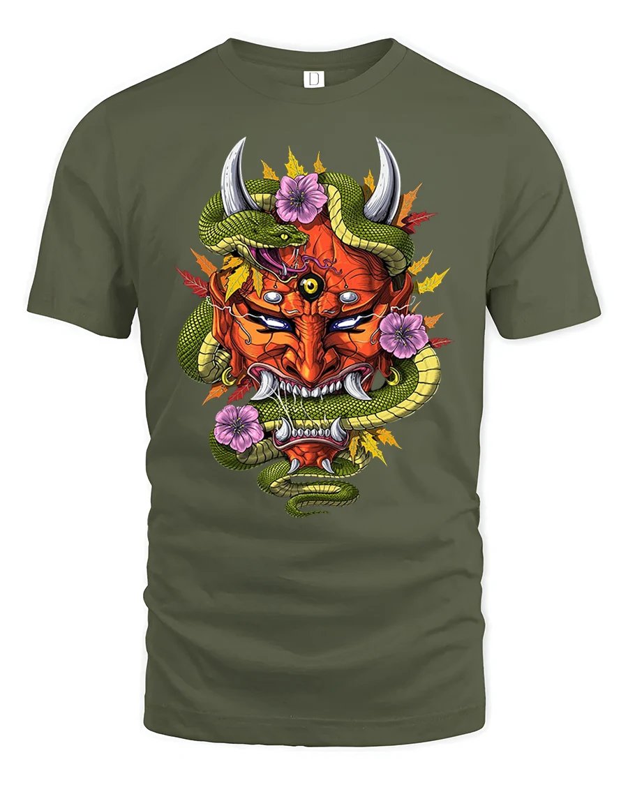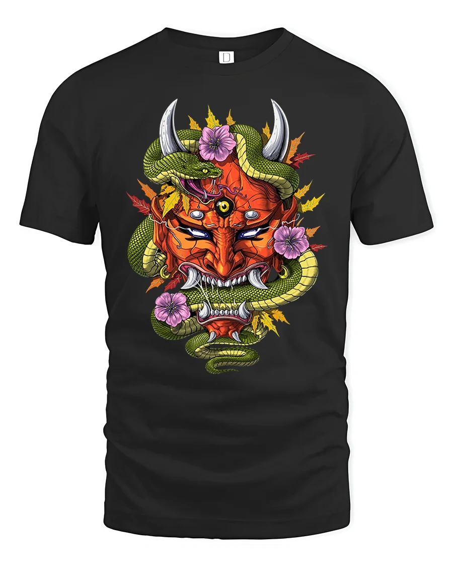 This Vibrant Oni Mask Snake Floral Fusion Fierce Graphic Art Tee showcases a powerful blend of mythology, intensity, and artistry. Featuring a fiery red oni mask entwined with a coiled green serpent, the design bursts with dramatic energy. The glowing eyes, sharp fangs, and detailed horns create a striking contrast against the soft floral accents and vivid autumn leaves surrounding the mask. This dynamic composition brings together fearsome strength and delicate beauty, making the tshirt truly captivating.
