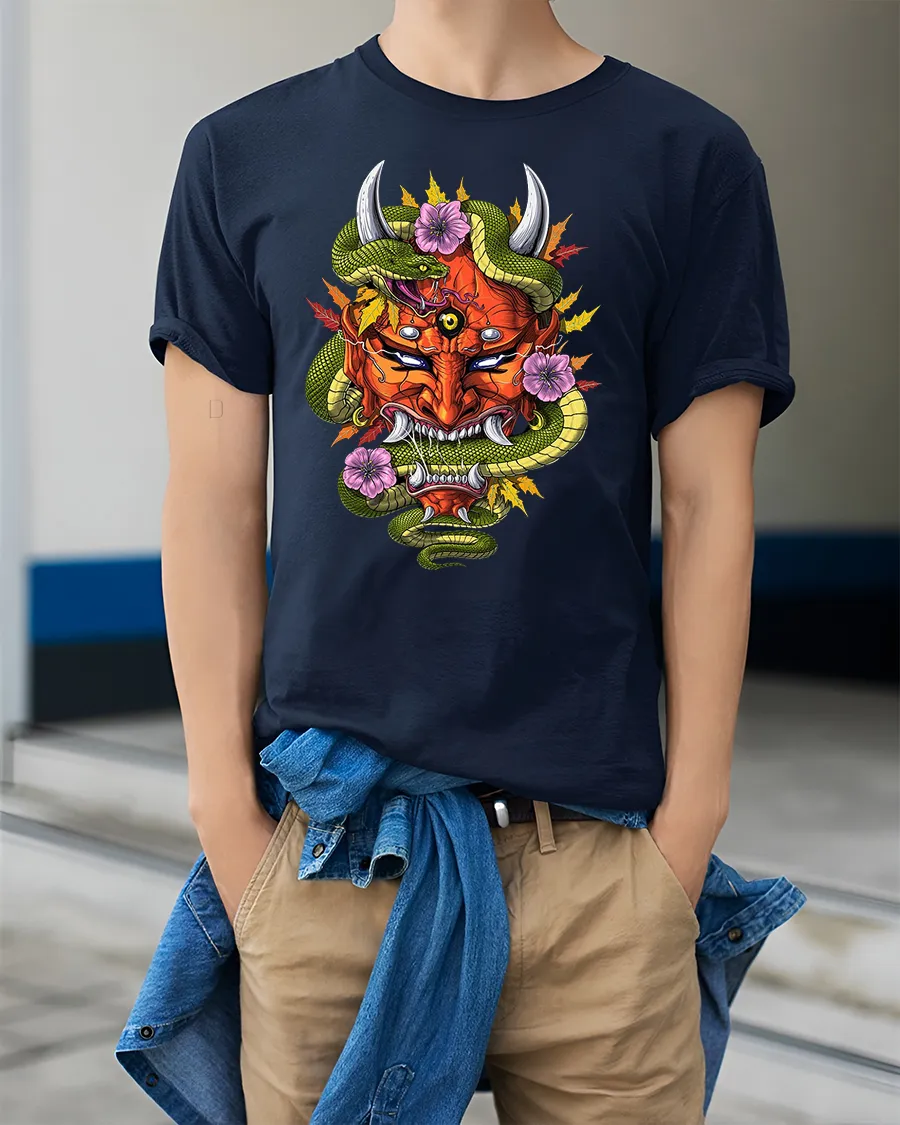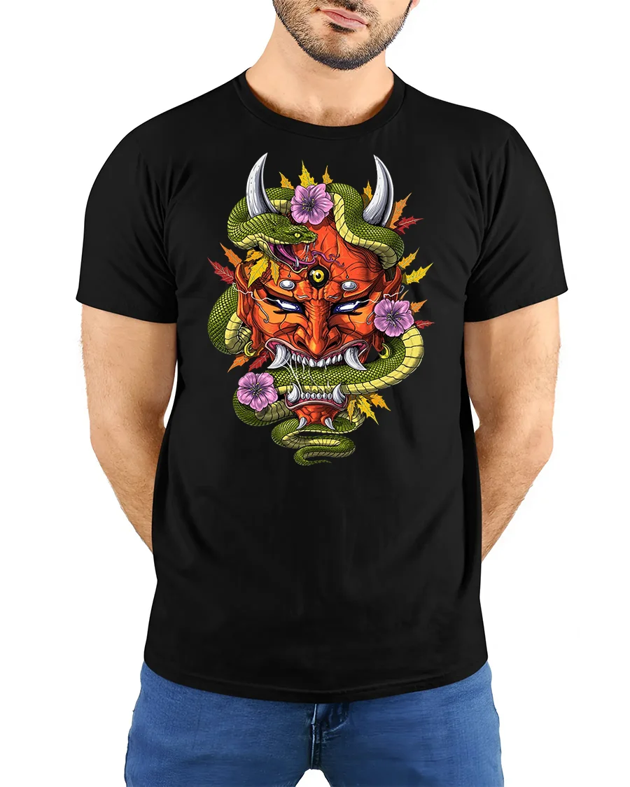 Wearing the Vibrant Oni Mask Snake Floral Fusion Fierce Graphic Art Tee adds fearless style and cultural edge to any outfit. The intricate artwork makes it a conversation starter while offering a unique aesthetic that blends mythology, symbolism, and modern tattoo-style flair. This tshirt works beautifully with streetwear, casual looks, or artistic wardrobes seeking something visually striking and meaningful.