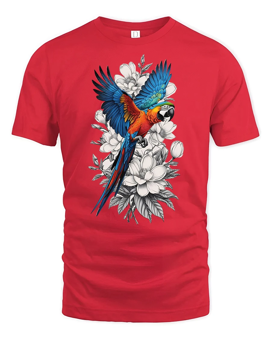 Vibrant Parrot Floral Art Nature Inspired Graphic Tshirt showcases a stunning macaw in mid flight surrounded by elegant blooming flowers.