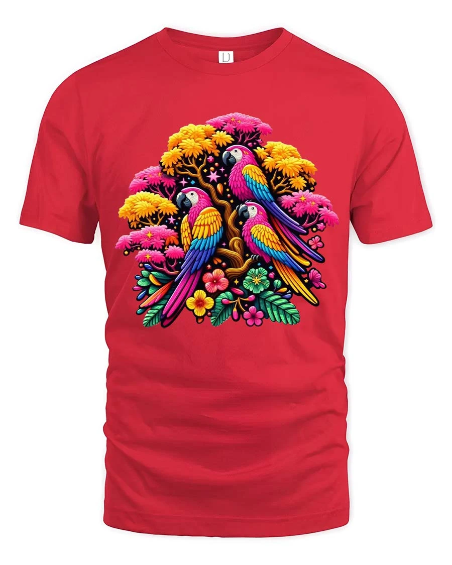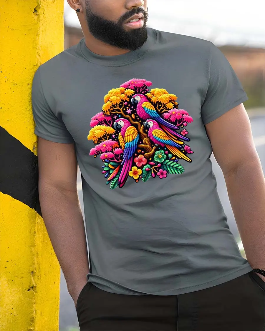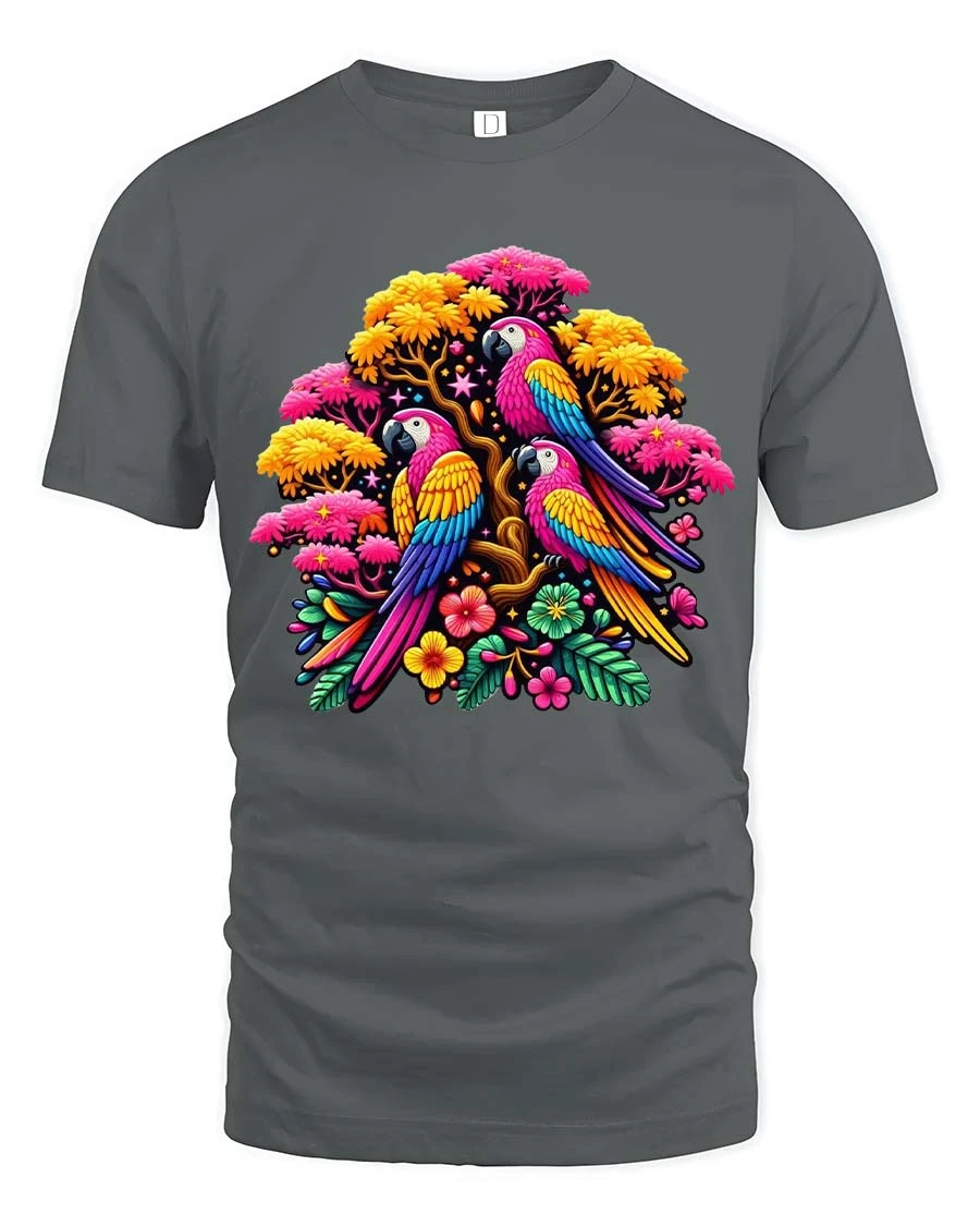 Vibrant Parrot Garden T Shirt Exotic Bird Floral Graphic Tee showcases a stunning arrangement of vibrant parrots surrounded by blooming flowers and lush foliage.