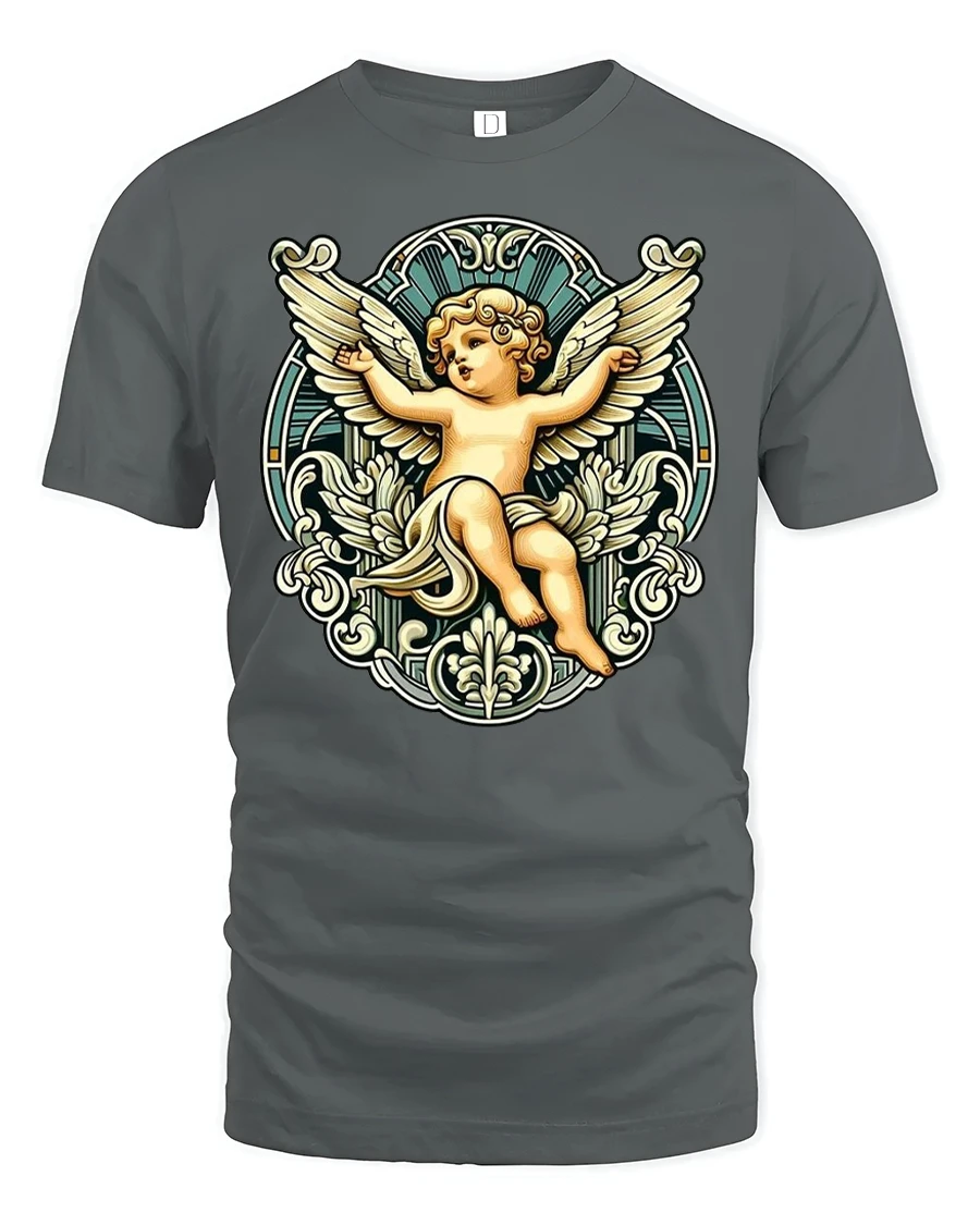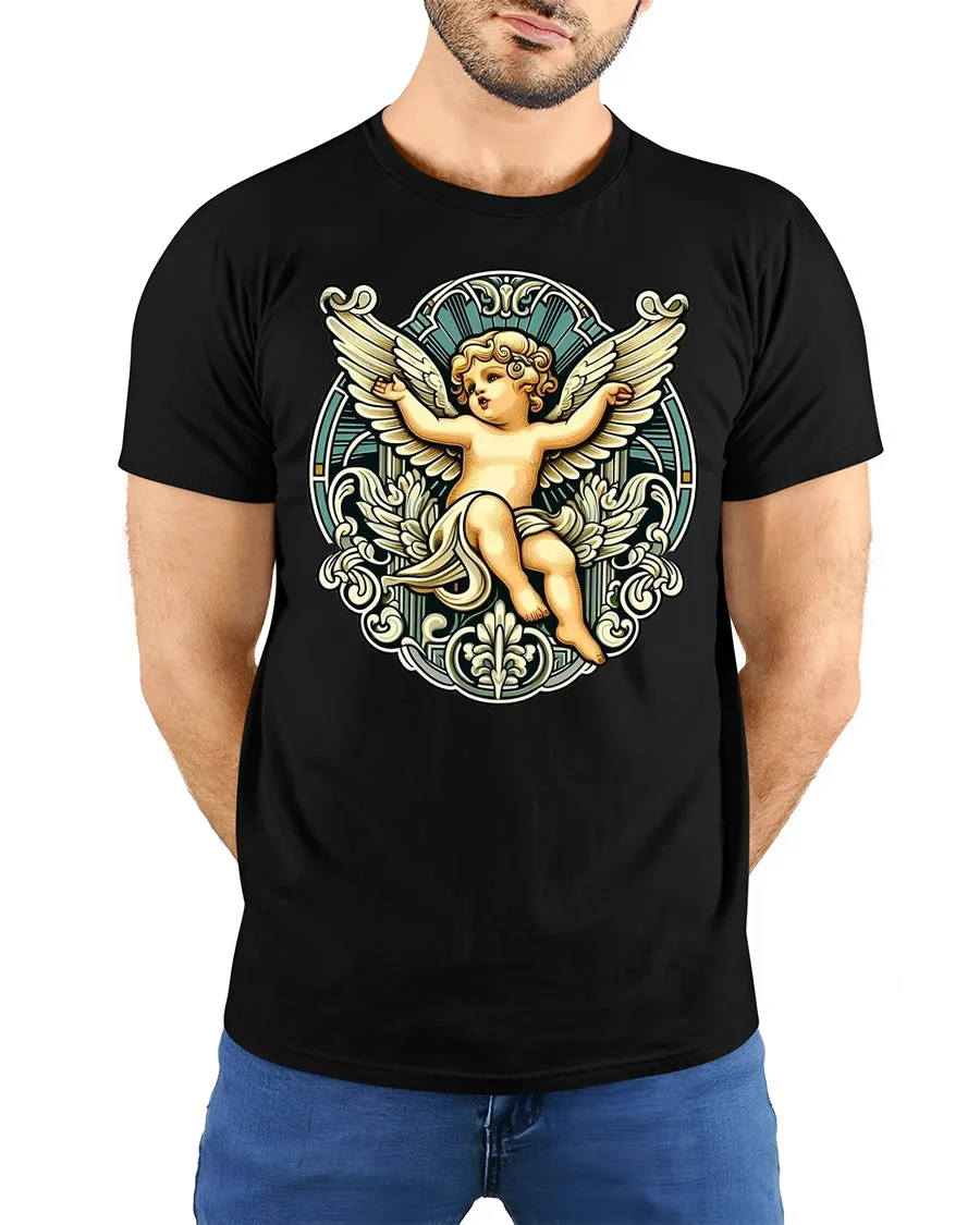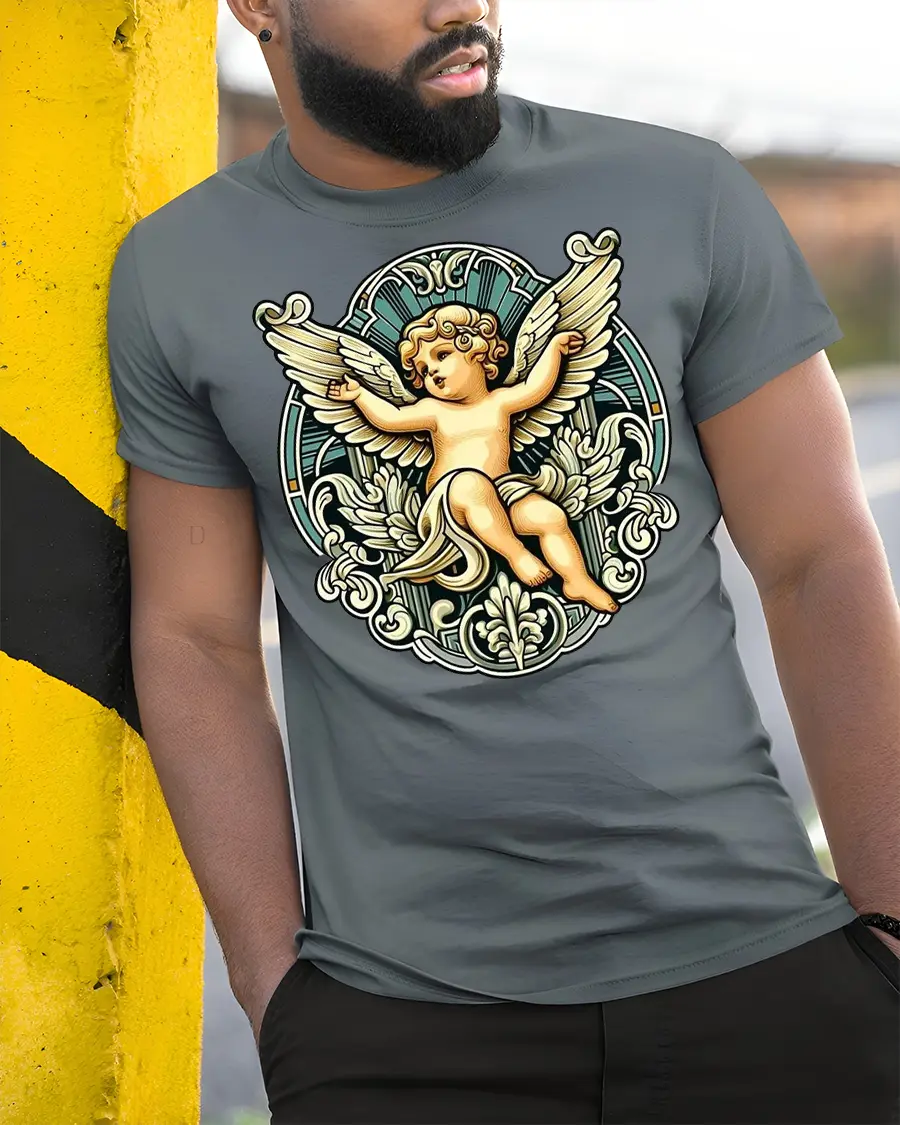 Featuring a beautifully detailed cherub with golden wings and classical ornaments, this tee perfectly blends vintage style with modern streetwear.