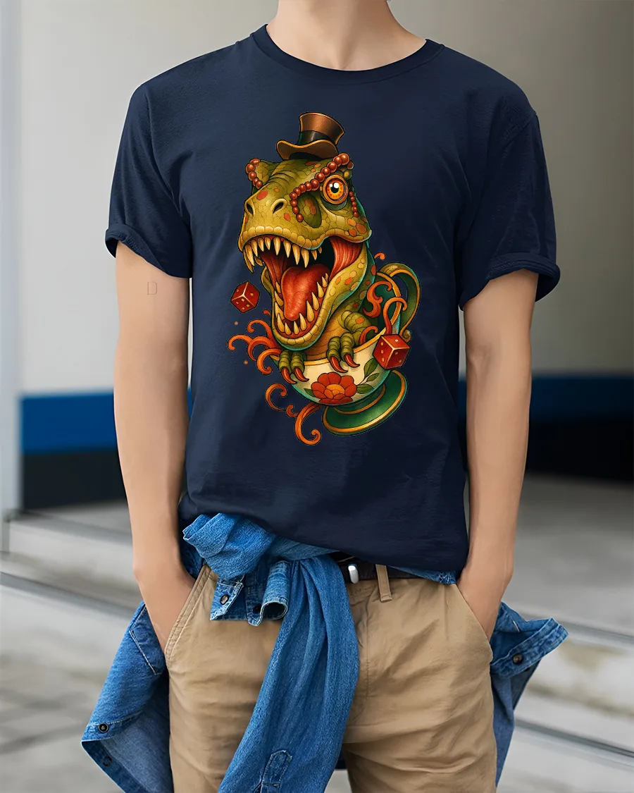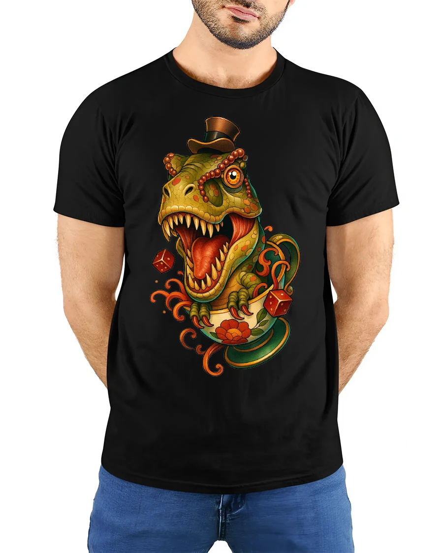 This T Rex tee adds humor and personality to any casual outfit while celebrating the fun of imaginative artwork. The unique mix of vintage teacup patterns, cartoon styling, and a lively dinosaur gives the design a whimsical appeal. Whether you enjoy novelty graphics or love conversation-starting apparel, this tshirt delivers a memorable style experience.