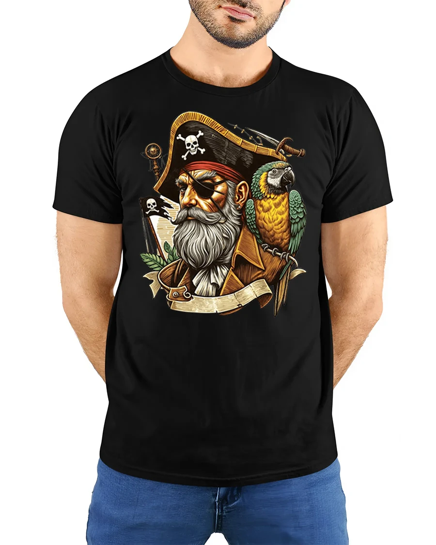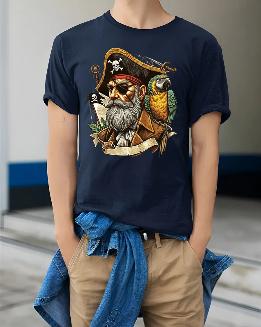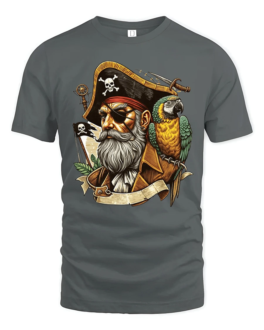Vintage Pirate Captain Tee with Parrot and Bold Nautical Art delivers a striking blend of adventure, character, and bold maritime style. Featuring a rugged pirate captain with his iconic eye patch, detailed beard, and a brilliantly colored parrot perched on his shoulder, this design instantly grabs attention. The vintage-style illustration captures the spirit of high-seas exploration, making the tee a standout piece with both personality and classic charm.