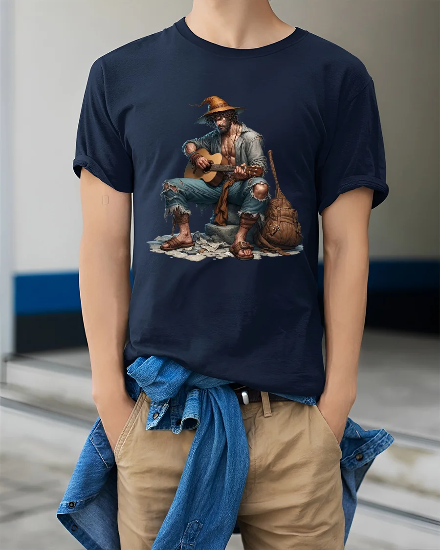 The Wandering Guitar Player Street Music Illustration Graphic T Shirt pairs effortlessly with jeans jackets or layered outfits.