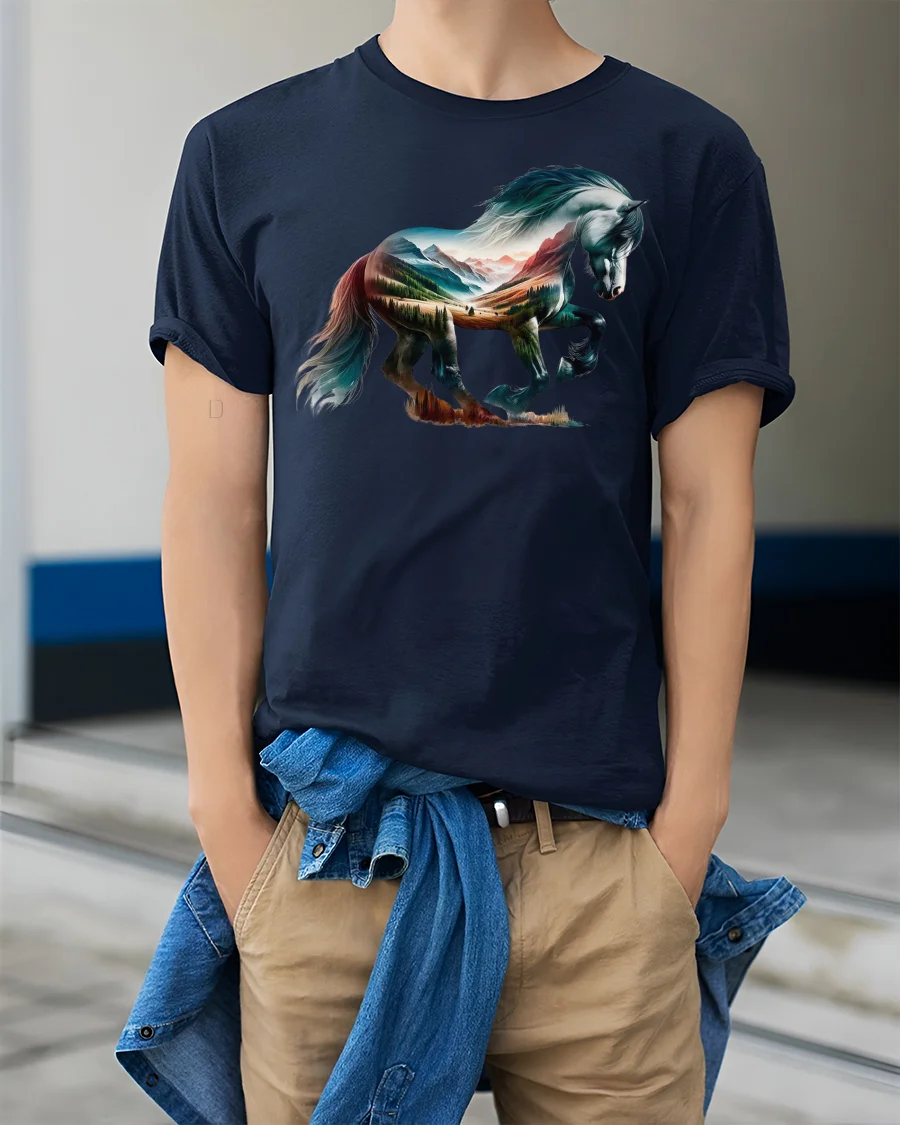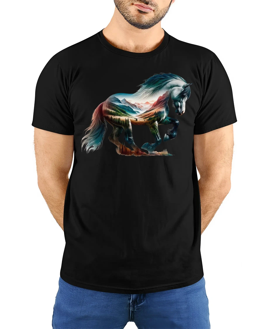 The detailed artwork showcases a majestic horse filled with a breathtaking mountain and forest scene, symbolizing power, peace, and adventure.