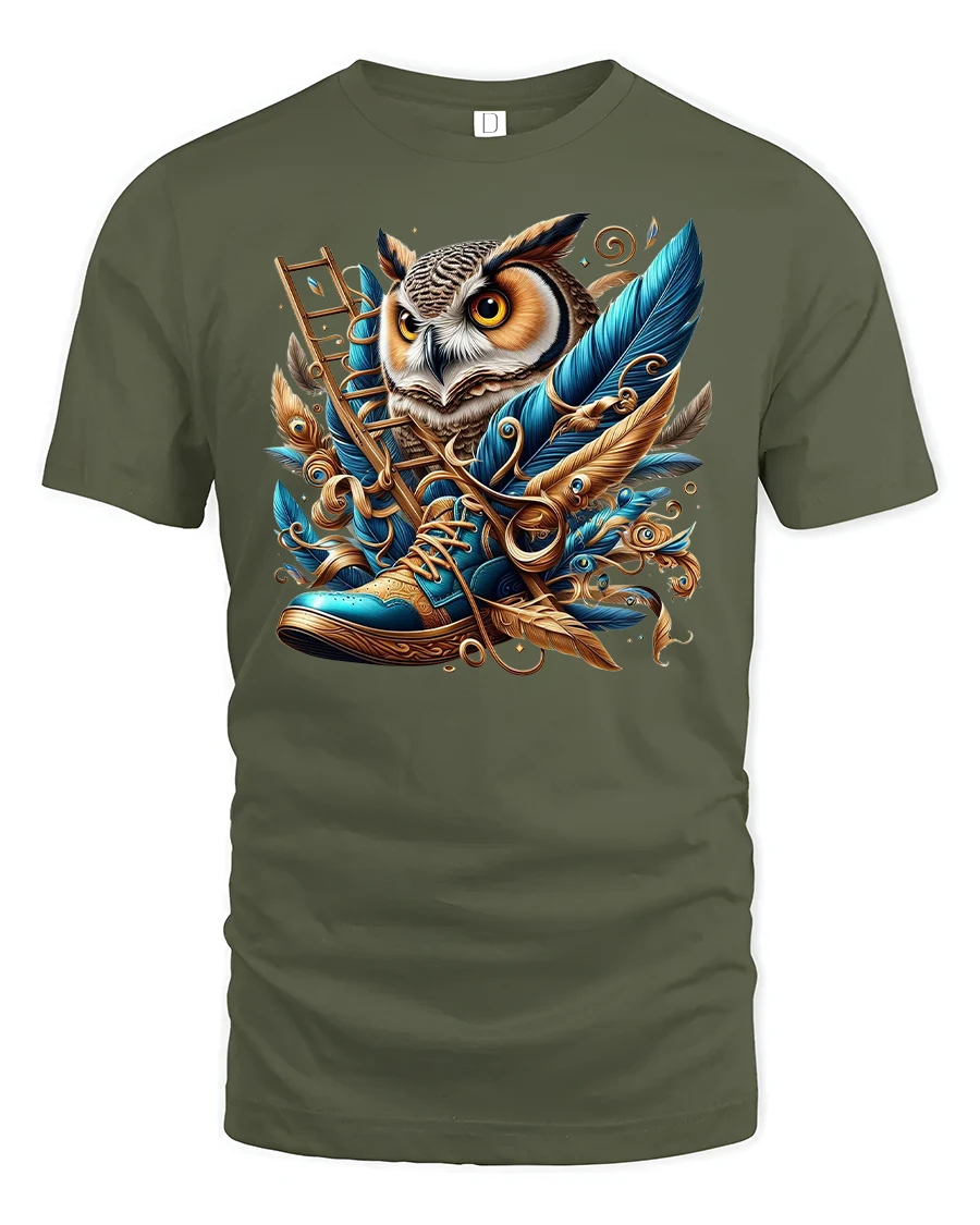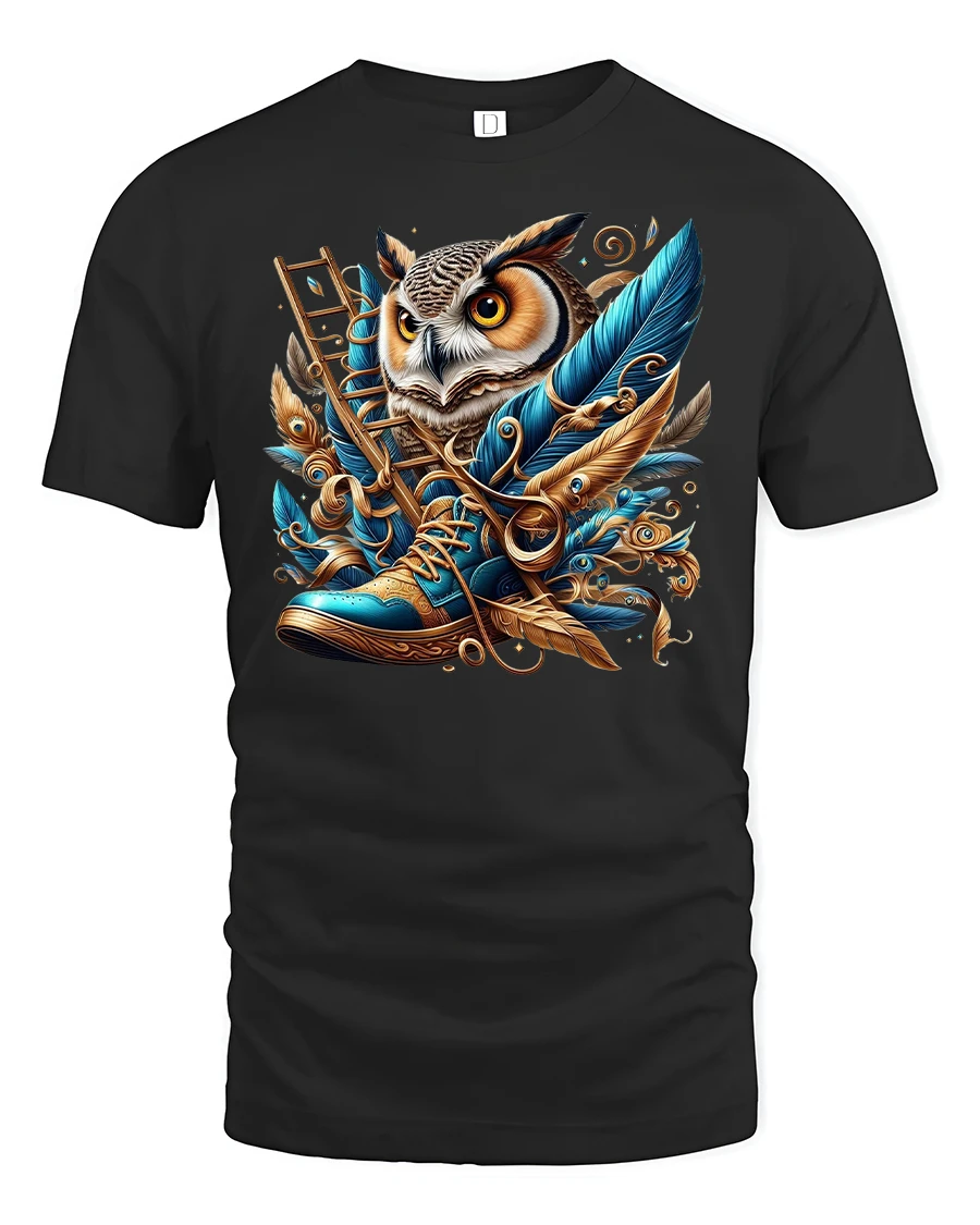 Wise Owl in Boots Golden Feathers Fantasy Art T-Shirt is a perfect blend of wisdom, imagination, and style. This eye-catching design features a majestic owl surrounded by intricate golden and blue feathers, perched on a pair of artistic boots — a symbol of adventure and intelligence combined. It’s not just a t-shirt; it’s wearable art that tells a story of curiosity and creativity.