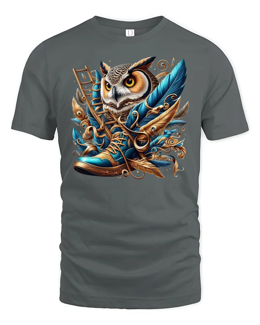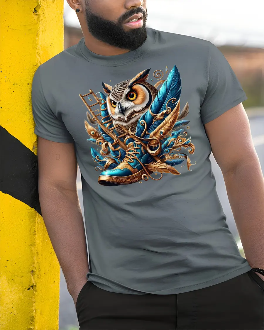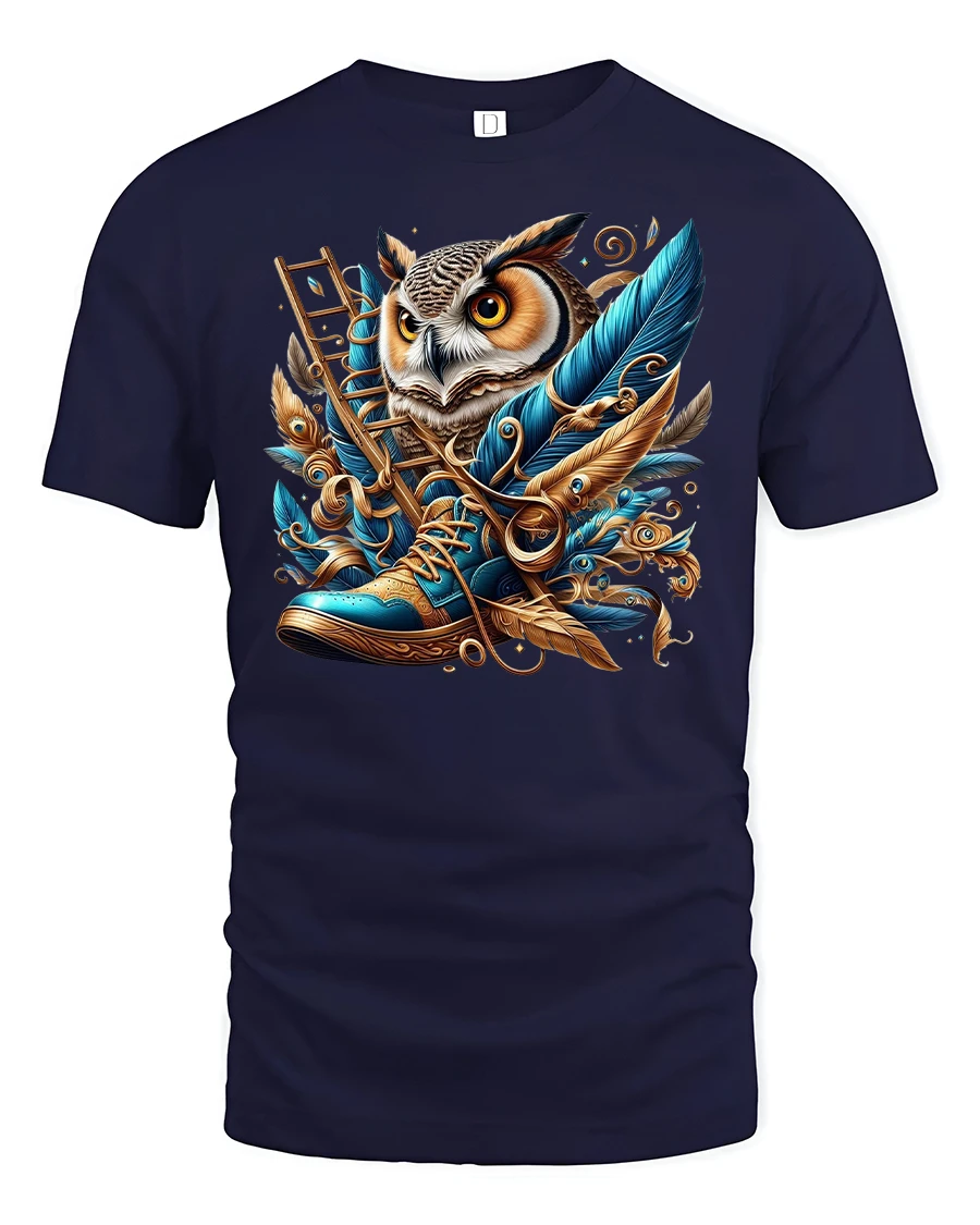 Perfect for owl lovers, fantasy art fans, or anyone who appreciates unique design, this tee stands out for its stunning detail and vivid colors. The mix of metallic gold and deep blue tones adds a luxurious touch that elevates any casual outfit, making it a favorite for both nature enthusiasts and art collectors.