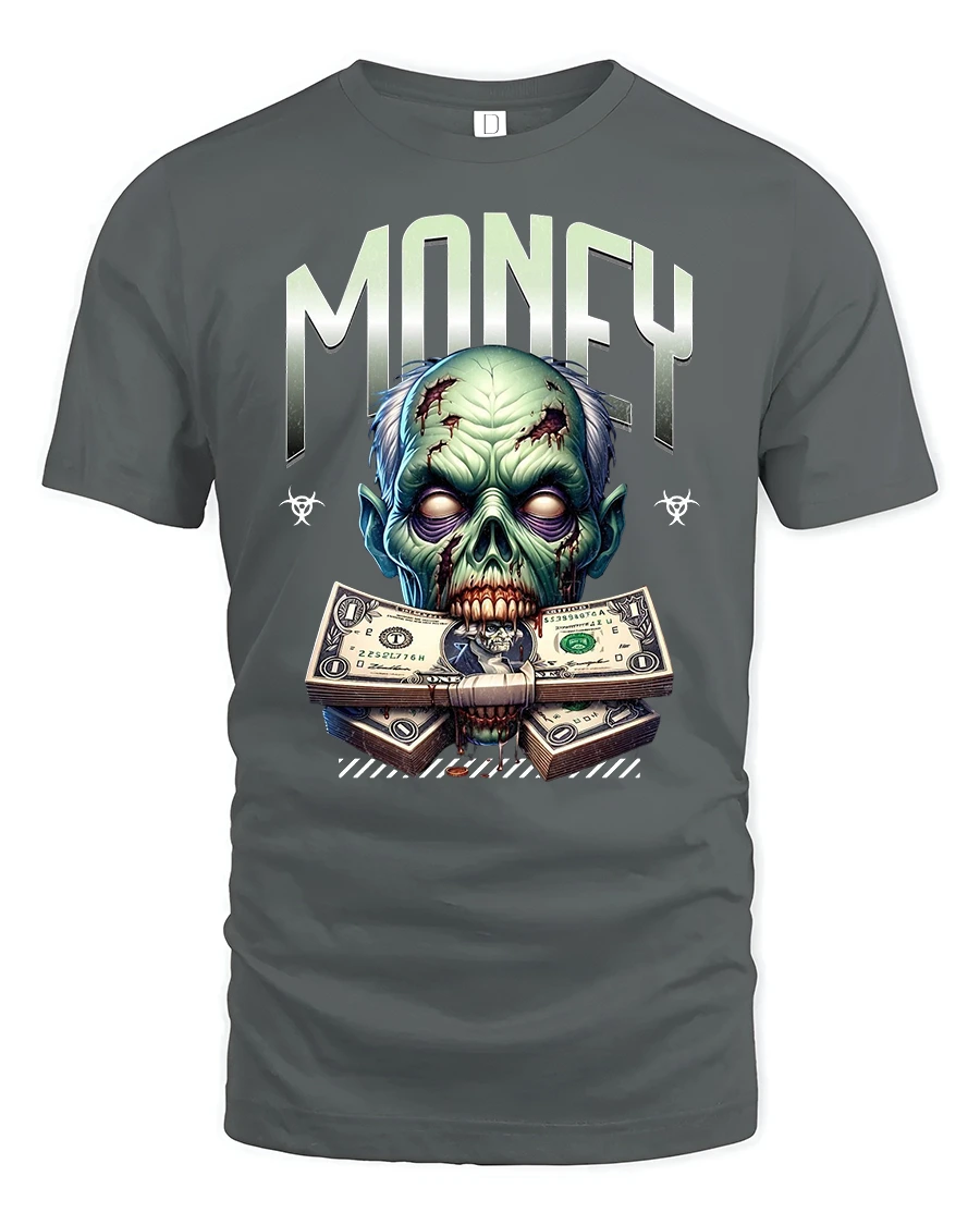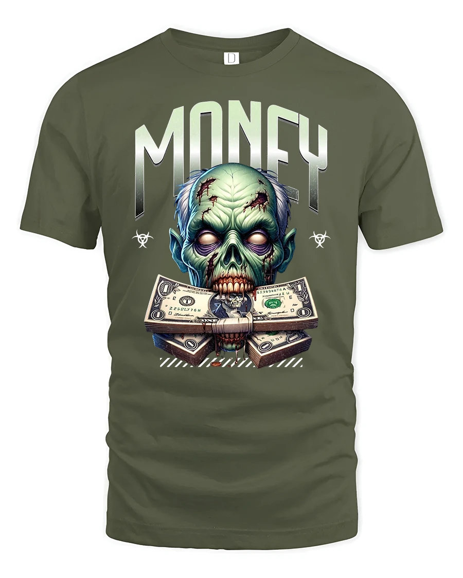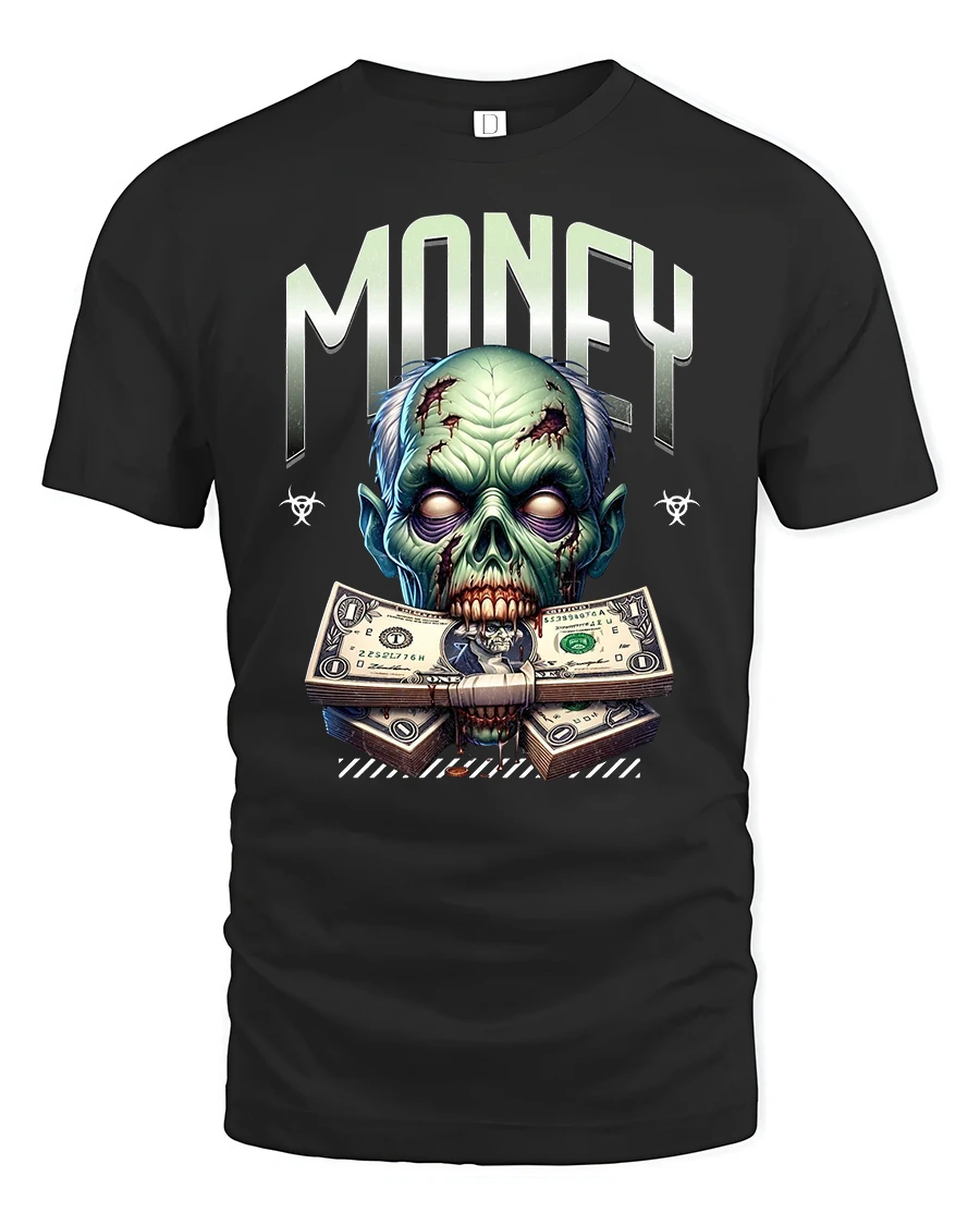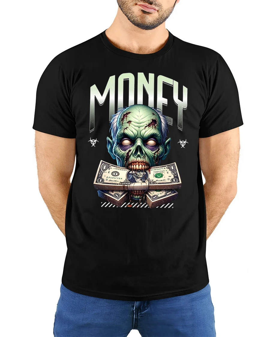 Stand out in bold style with the Zombie Money Graphic Tee with Scary Cool Design, featuring a creepy zombie face gripping stacks of dollar bills. This design blends horror vibes with a fearless streetwear look, perfect for anyone who loves edgy graphic tees.